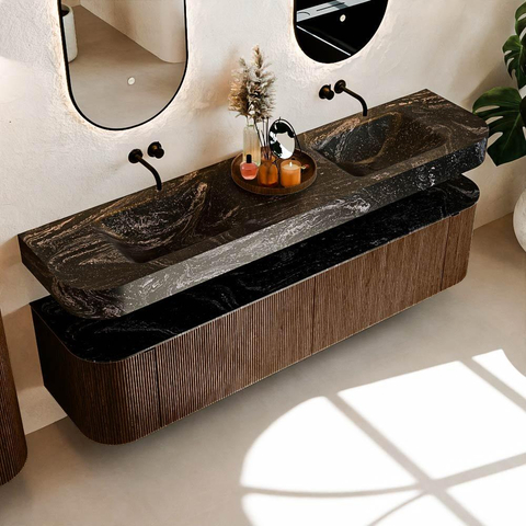 MONDIAZ THOR-DLUX 190cm badmeubel ronding links + rechts kleur Walnut met 2 lades en 2 deuren. Vrijhangende wastafel CLOUD Dubbel zonder kraangat kleur Lava.