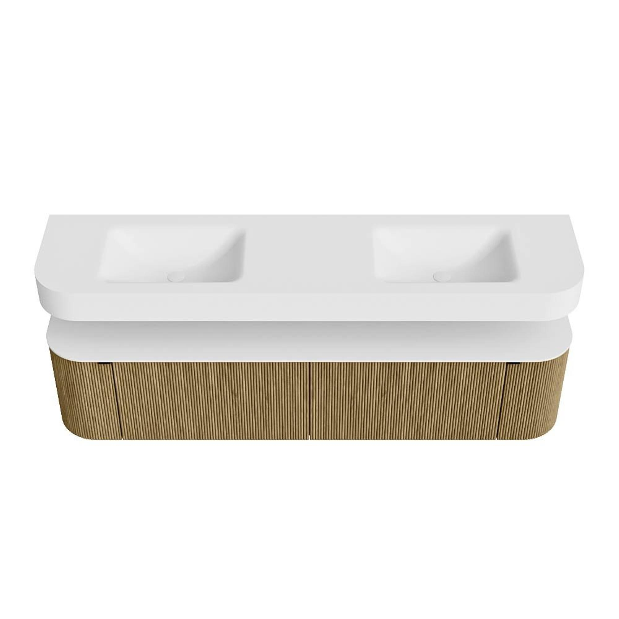 Boven het meubel zweeft een bijpassende, vrij hangende wastafel met afgeronde hoeken – perfect afgestemd op de vorm van de kast. De wastafel is uitgevoerd in Solid Surface en volgt subtiel de lijnen van het onderliggende meubel, waardoor een harmonieus geheel ontstaat. Het Solid Surface topblad vormt een sterke, onderhoudsvriendelijke basis en maakt de combinatie compleet.