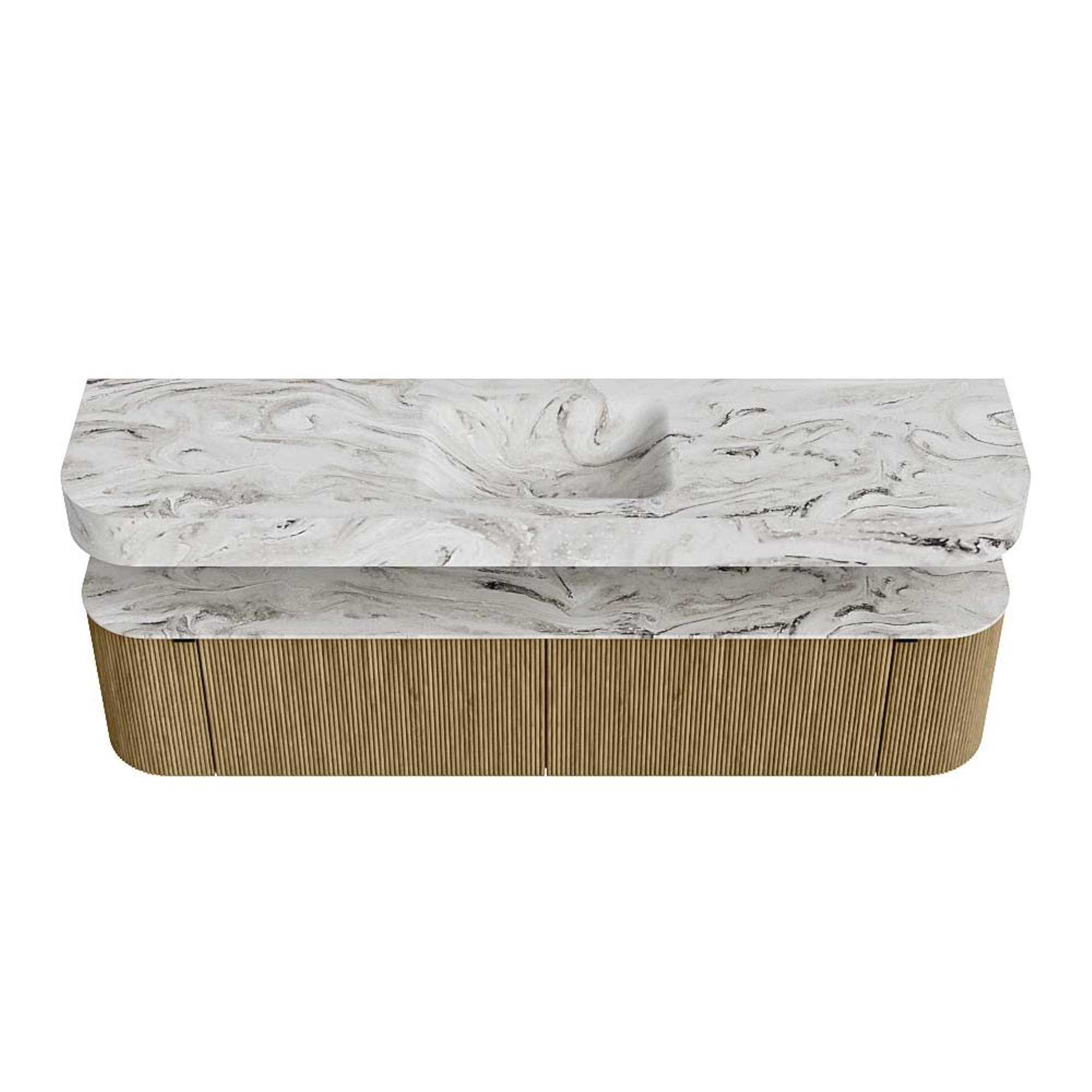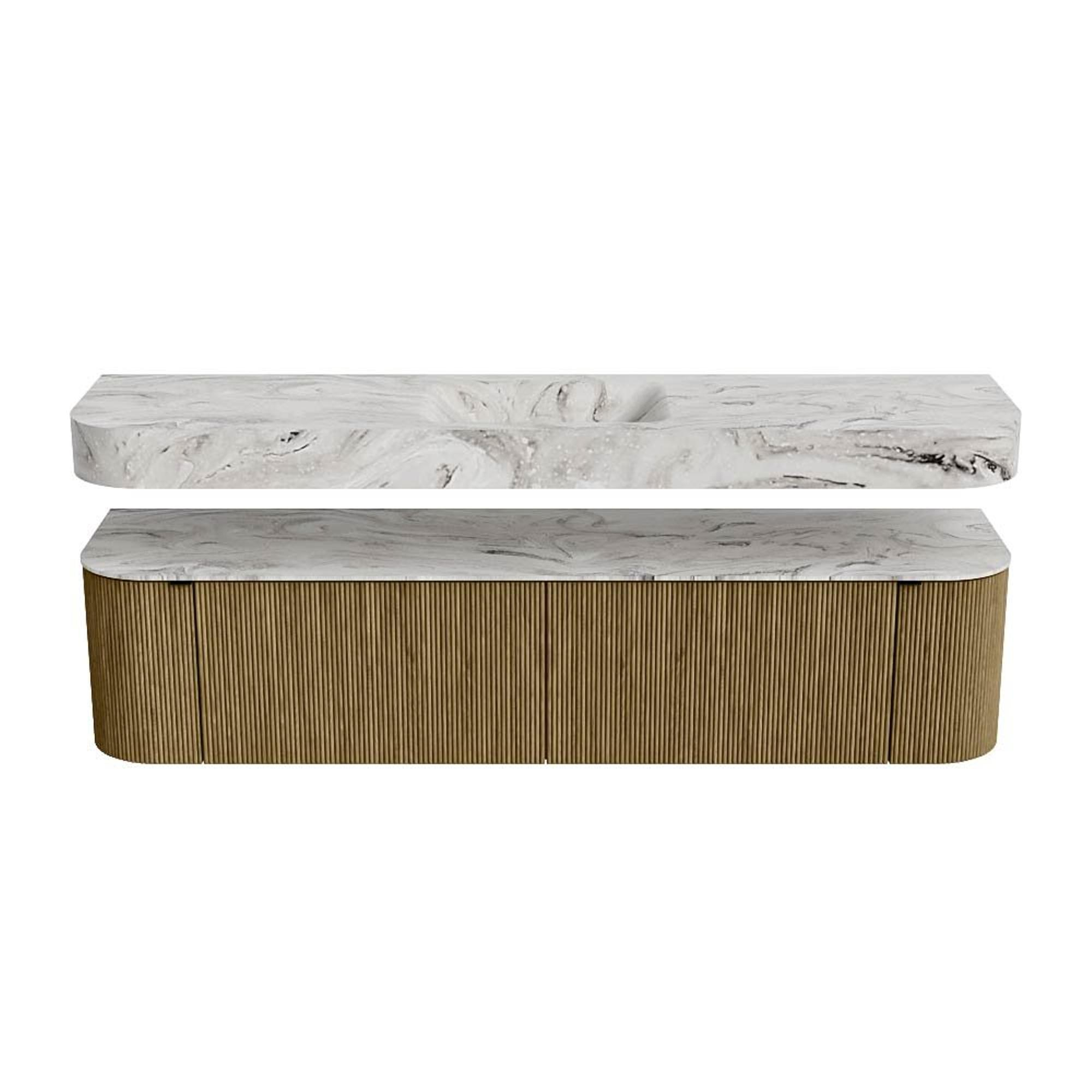 Boven het meubel zweeft een bijpassende, vrij hangende wastafel met afgeronde hoeken – perfect afgestemd op de vorm van de kast. De wastafel is uitgevoerd in Solid Surface en volgt subtiel de lijnen van het onderliggende meubel, waardoor een harmonieus geheel ontstaat. Het Solid Surface topblad vormt een sterke, onderhoudsvriendelijke basis en maakt de combinatie compleet.