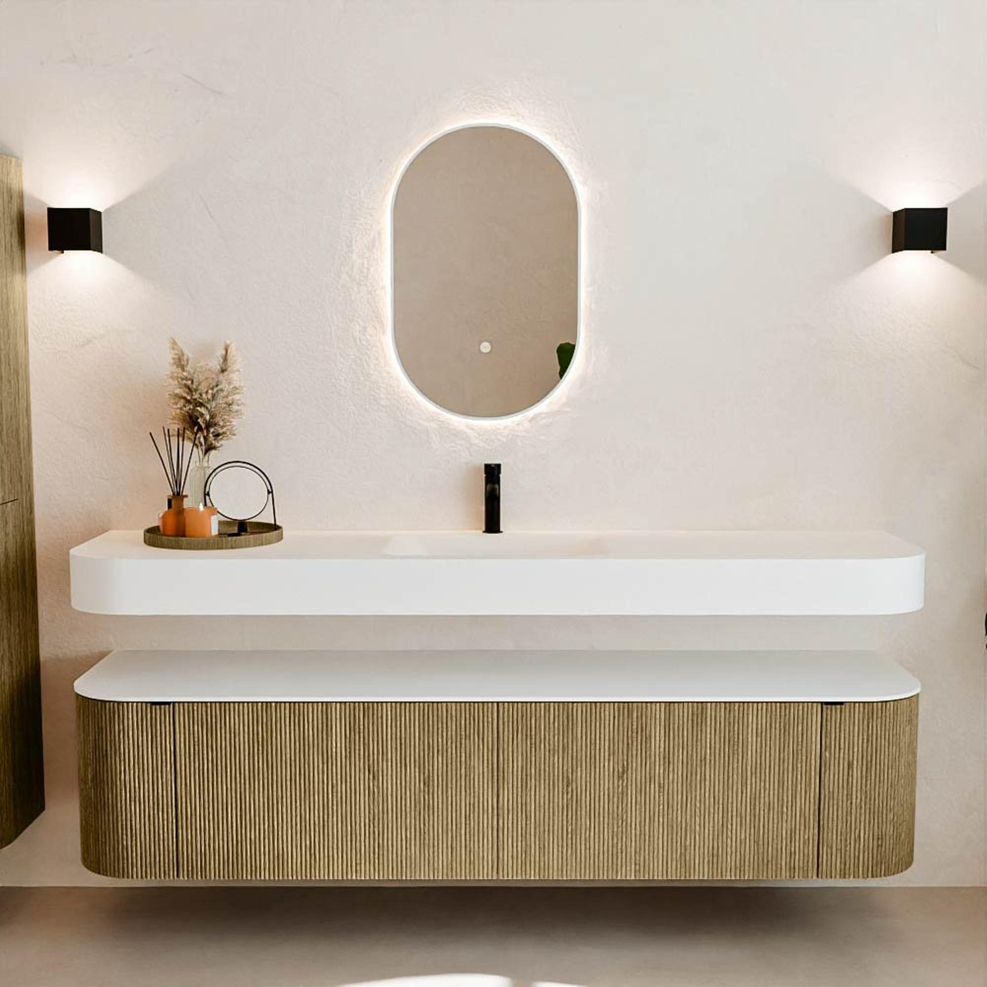 Boven het meubel zweeft een bijpassende, vrij hangende wastafel met afgeronde hoeken – perfect afgestemd op de vorm van de kast. De wastafel is uitgevoerd in Solid Surface en volgt subtiel de lijnen van het onderliggende meubel, waardoor een harmonieus geheel ontstaat. Het Solid Surface topblad vormt een sterke, onderhoudsvriendelijke basis en maakt de combinatie compleet.