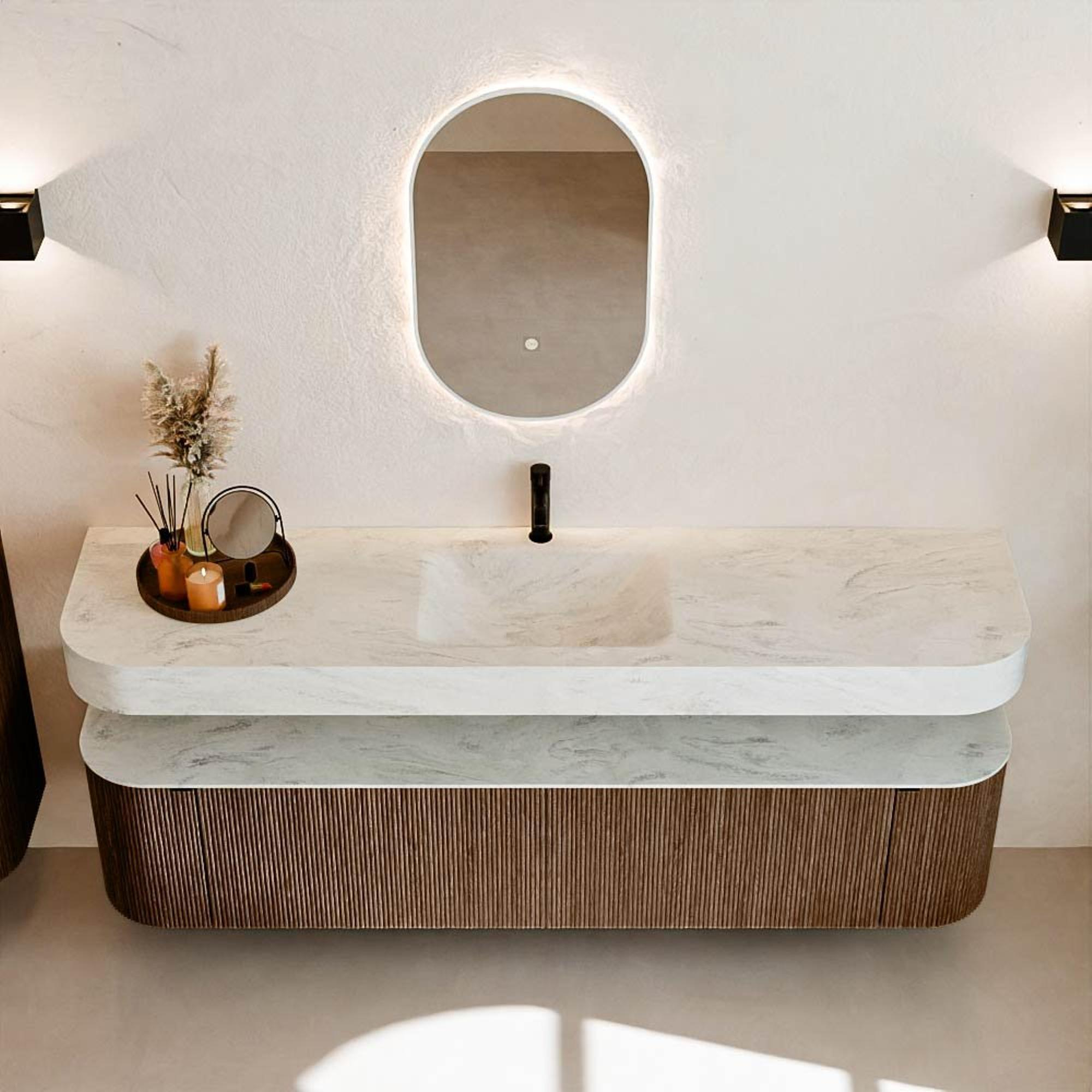 Boven het meubel zweeft een bijpassende, vrij hangende wastafel met afgeronde hoeken – perfect afgestemd op de vorm van de kast. De wastafel is uitgevoerd in Solid Surface en volgt subtiel de lijnen van het onderliggende meubel, waardoor een harmonieus geheel ontstaat. Het Solid Surface topblad vormt een sterke, onderhoudsvriendelijke basis en maakt de combinatie compleet.