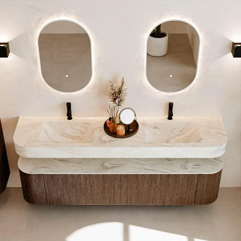 MONDIAZ THOR-DLUX 190cm badmeubel ronding links + rechts kleur Walnut met 2 lades en 2 deuren. Vrijhangende wastafel CLOUD Dubbel 2 kraangaten kleur Ostra.