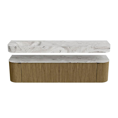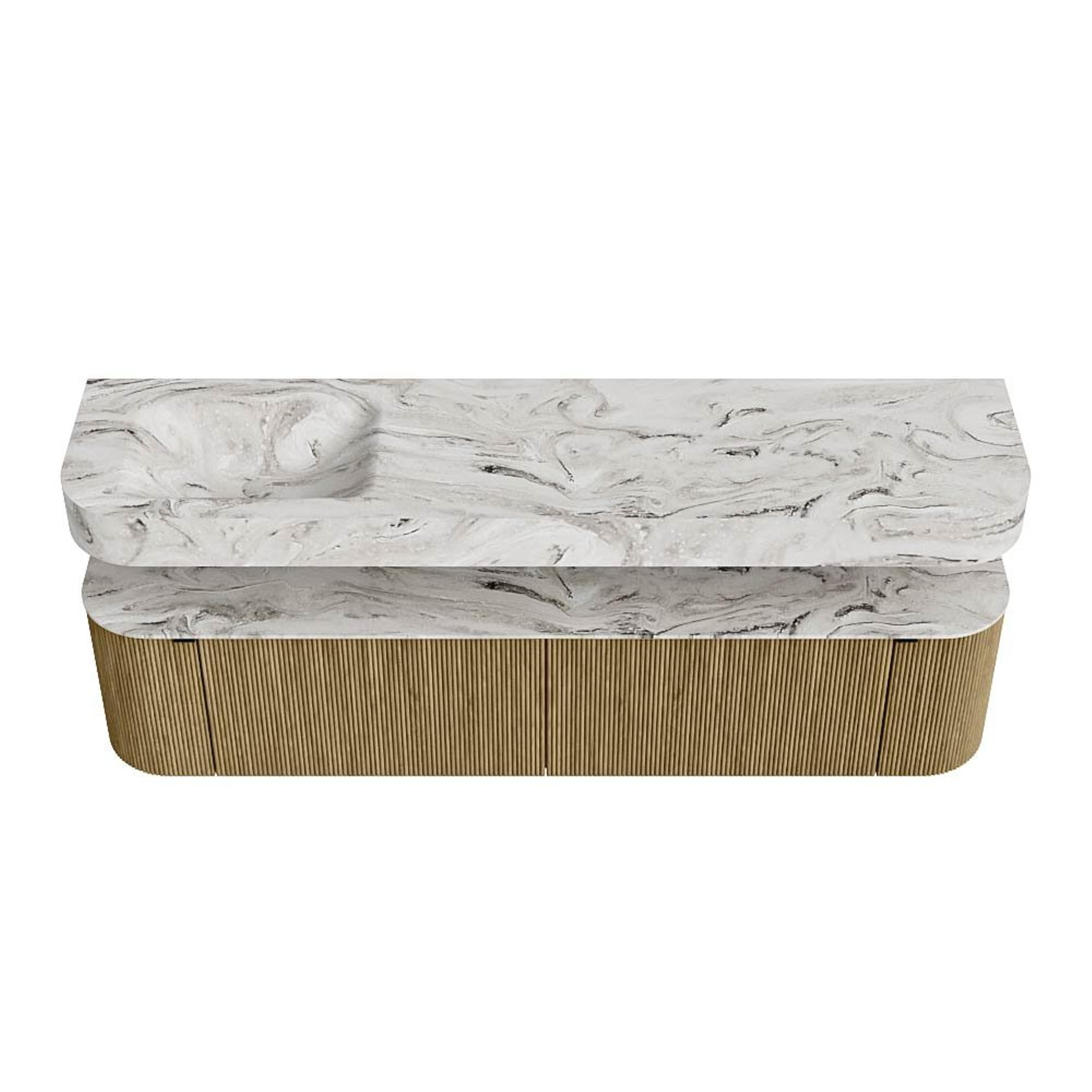 MONDIAZ THOR-DLUX 190cm badmeubel ronding links + rechts kleur Dusk met 2 lades en 2 deuren. Vrijhangende wastafel CLOUD Links 1 kraangat kleur Glace.