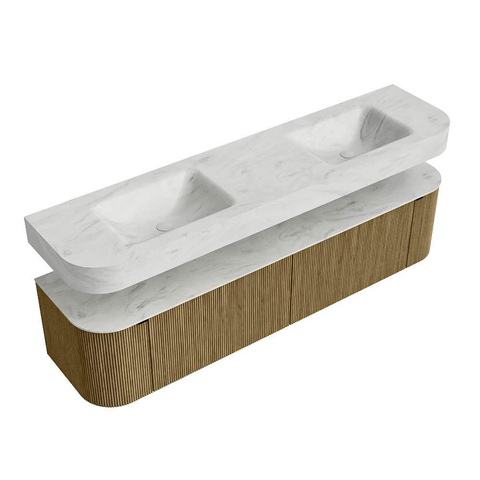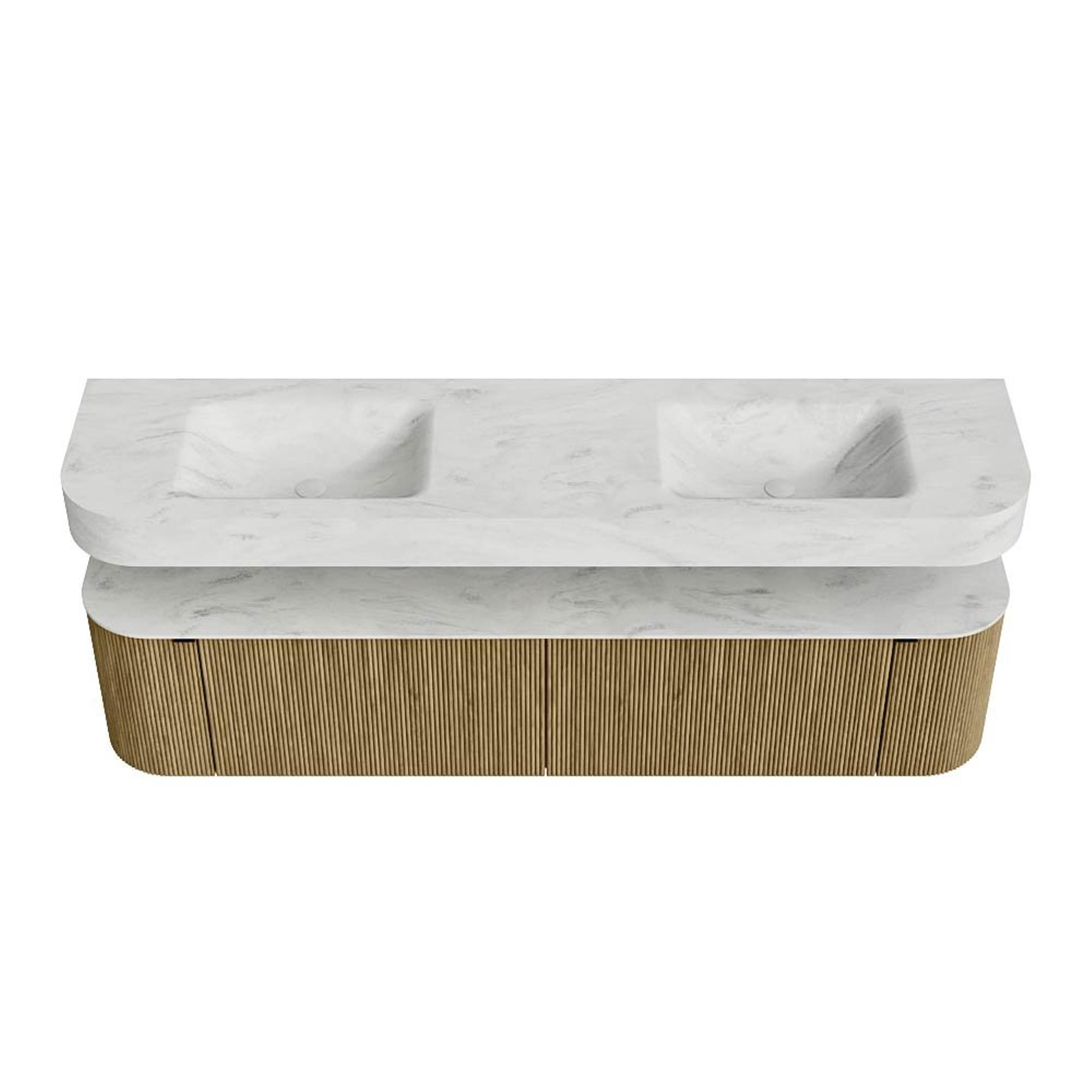 Boven het meubel zweeft een bijpassende, vrij hangende wastafel met afgeronde hoeken – perfect afgestemd op de vorm van de kast. De wastafel is uitgevoerd in Solid Surface en volgt subtiel de lijnen van het onderliggende meubel, waardoor een harmonieus geheel ontstaat. Het Solid Surface topblad vormt een sterke, onderhoudsvriendelijke basis en maakt de combinatie compleet.