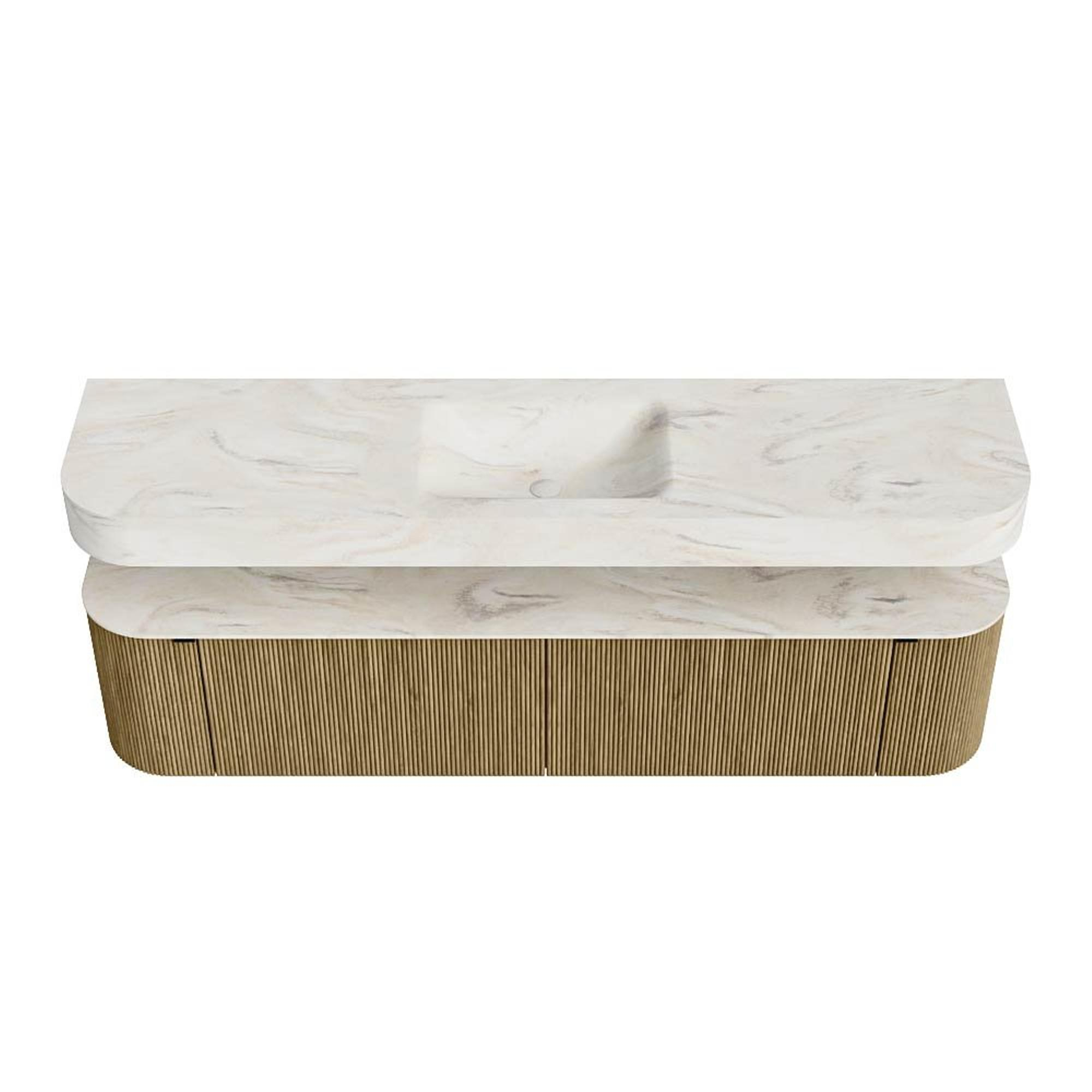 Boven het meubel zweeft een bijpassende, vrij hangende wastafel met afgeronde hoeken – perfect afgestemd op de vorm van de kast. De wastafel is uitgevoerd in Solid Surface en volgt subtiel de lijnen van het onderliggende meubel, waardoor een harmonieus geheel ontstaat. Het Solid Surface topblad vormt een sterke, onderhoudsvriendelijke basis en maakt de combinatie compleet.