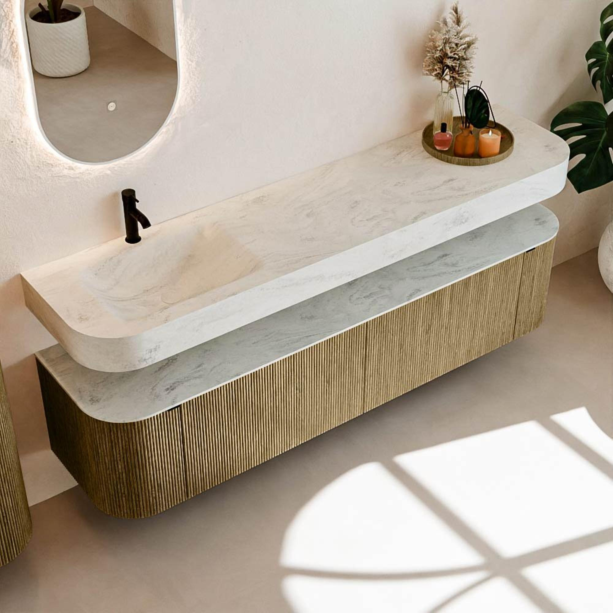 Boven het meubel zweeft een bijpassende, vrij hangende wastafel met afgeronde hoeken – perfect afgestemd op de vorm van de kast. De wastafel is uitgevoerd in Solid Surface en volgt subtiel de lijnen van het onderliggende meubel, waardoor een harmonieus geheel ontstaat. Het Solid Surface topblad vormt een sterke, onderhoudsvriendelijke basis en maakt de combinatie compleet.