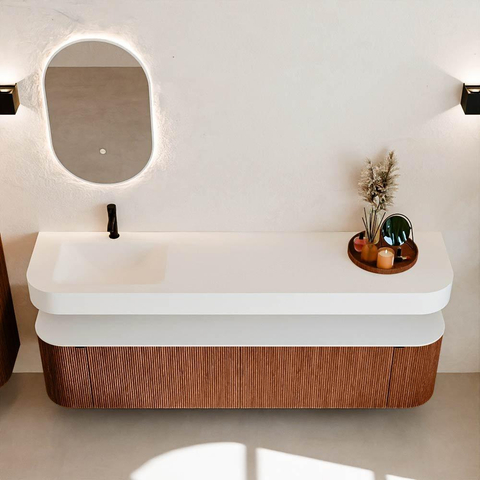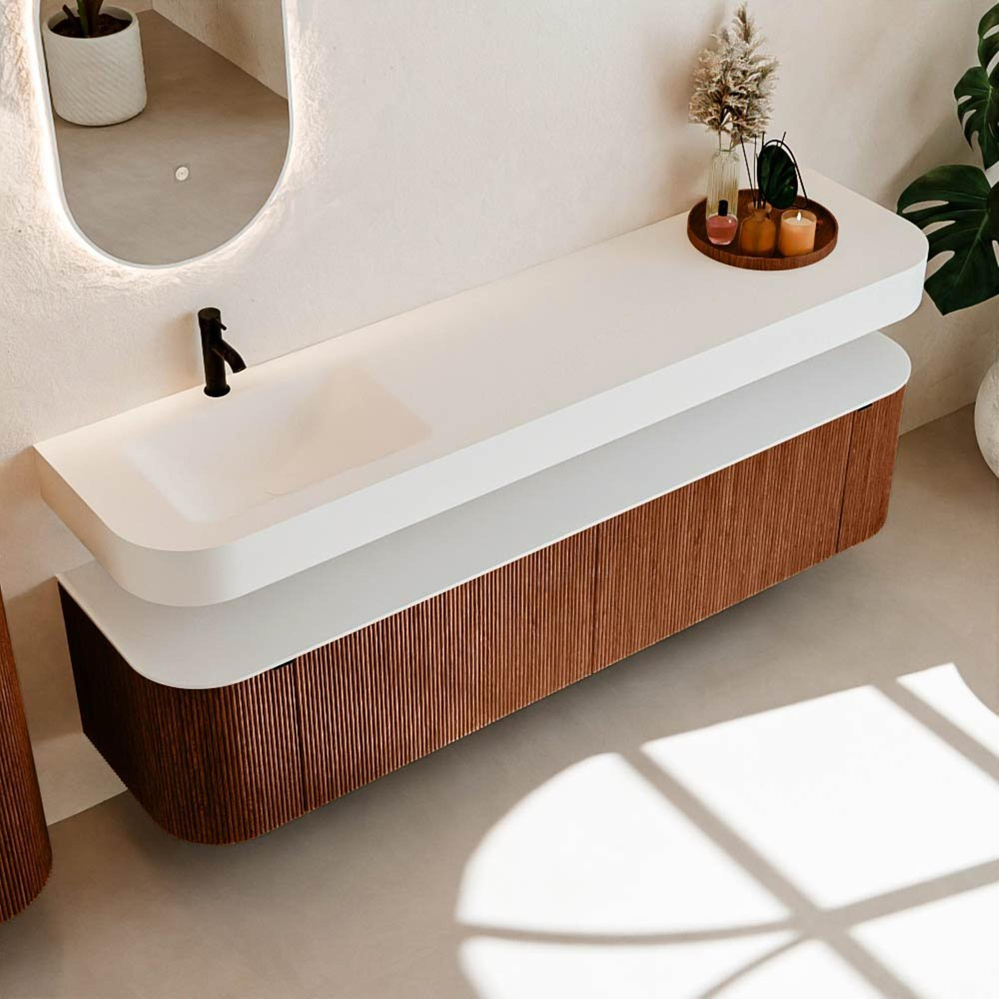 Boven het meubel zweeft een bijpassende, vrij hangende wastafel met afgeronde hoeken – perfect afgestemd op de vorm van de kast. De wastafel is uitgevoerd in Solid Surface en volgt subtiel de lijnen van het onderliggende meubel, waardoor een harmonieus geheel ontstaat. Het Solid Surface topblad vormt een sterke, onderhoudsvriendelijke basis en maakt de combinatie compleet.