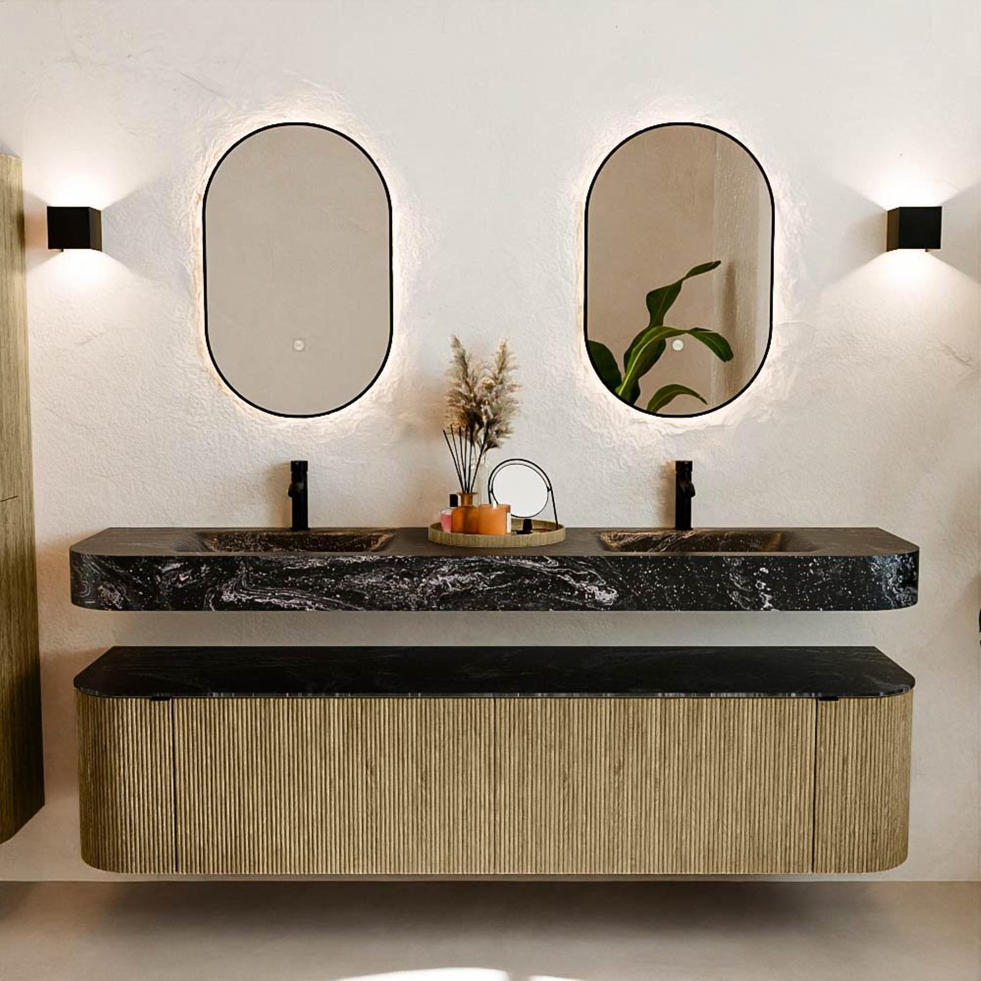 Natuurlijke materialen in warme tinten. De verticale ribbels brengen ritme en textuur in het ontwerp, terwijl het eikenhout zorgt voor een warme, ambachtelijke uitstraling. Kies uit 5 houttinten OAK, WALNUT, DUSK, SHADOW en RUBY zorgvuldig geselecteerde houtkleuren om zowel moderne als klassieke badkamers te verrijken.