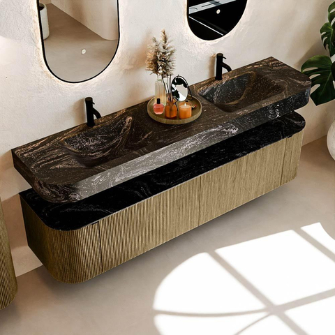 MONDIAZ THOR-DLUX 190cm badmeubel ronding links + rechts kleur Dusk met 2 lades en 2 deuren. Vrijhangende wastafel CLOUD Dubbel 2 kraangaten kleur Lava.