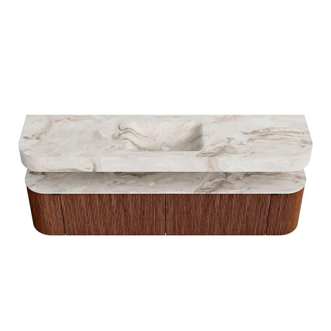 Boven het meubel zweeft een bijpassende, vrij hangende wastafel met afgeronde hoeken – perfect afgestemd op de vorm van de kast. De wastafel is uitgevoerd in Solid Surface en volgt subtiel de lijnen van het onderliggende meubel, waardoor een harmonieus geheel ontstaat. Het Solid Surface topblad vormt een sterke, onderhoudsvriendelijke basis en maakt de combinatie compleet.