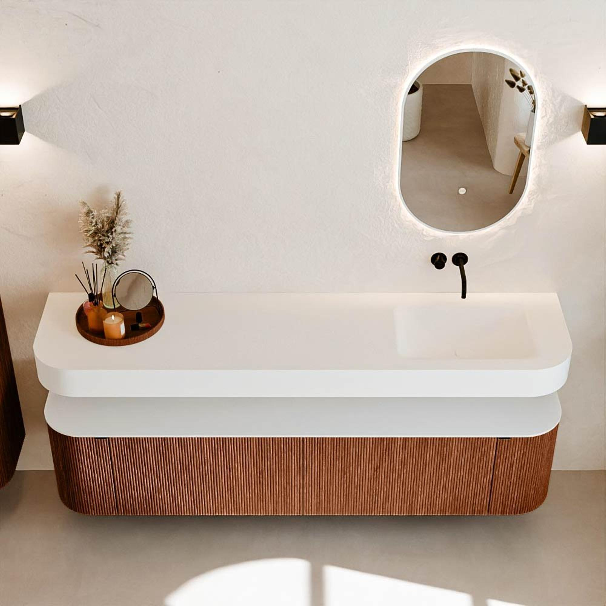 Boven het meubel zweeft een bijpassende, vrij hangende wastafel met afgeronde hoeken – perfect afgestemd op de vorm van de kast. De wastafel is uitgevoerd in Solid Surface en volgt subtiel de lijnen van het onderliggende meubel, waardoor een harmonieus geheel ontstaat. Het Solid Surface topblad vormt een sterke, onderhoudsvriendelijke basis en maakt de combinatie compleet.