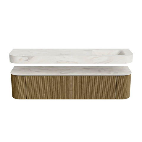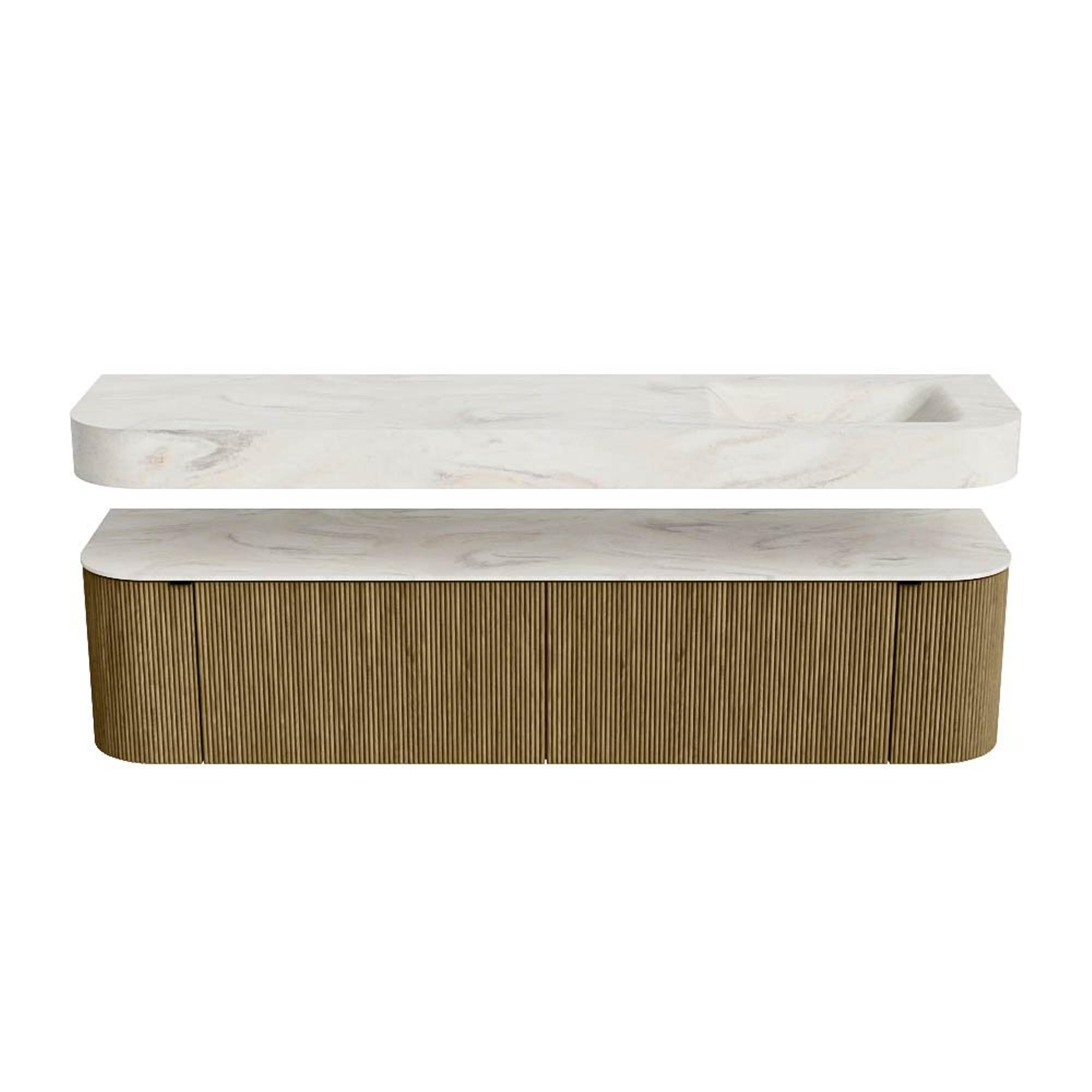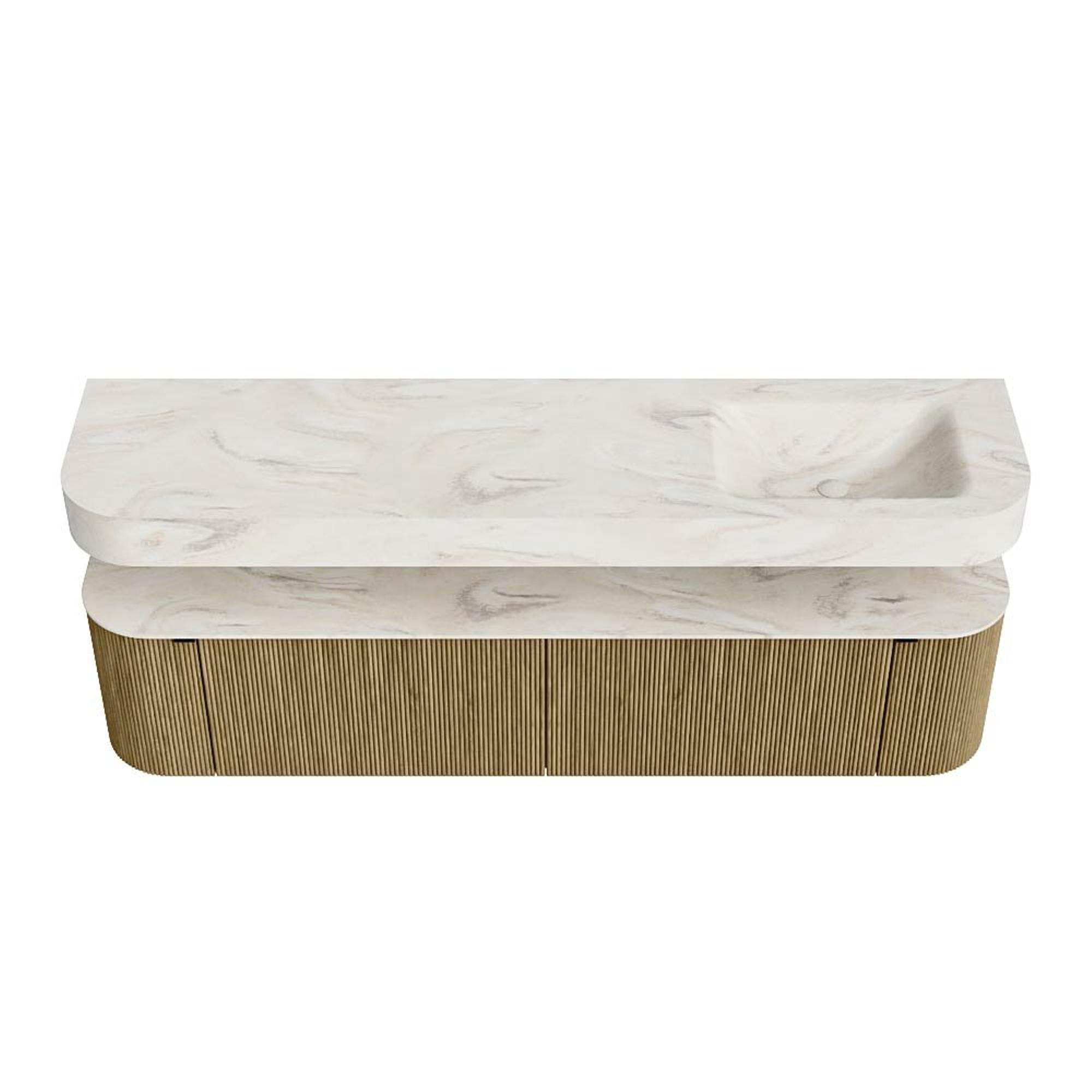 Boven het meubel zweeft een bijpassende, vrij hangende wastafel met afgeronde hoeken – perfect afgestemd op de vorm van de kast. De wastafel is uitgevoerd in Solid Surface en volgt subtiel de lijnen van het onderliggende meubel, waardoor een harmonieus geheel ontstaat. Het Solid Surface topblad vormt een sterke, onderhoudsvriendelijke basis en maakt de combinatie compleet.
