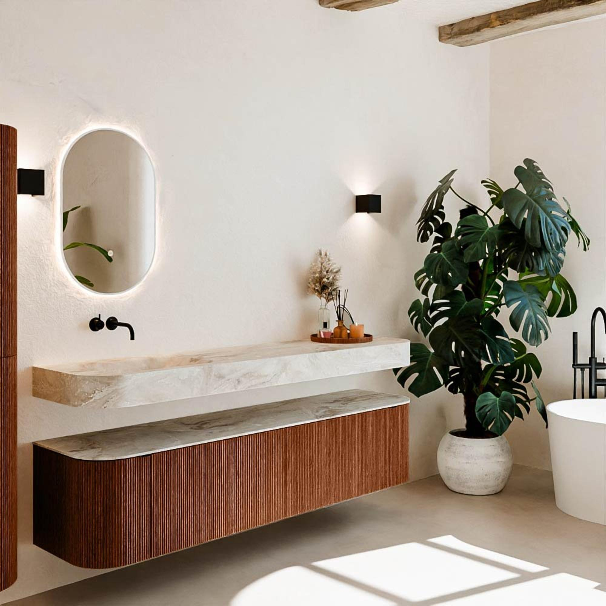 Natuurlijke materialen in warme tinten. De verticale ribbels brengen ritme en textuur in het ontwerp, terwijl het eikenhout zorgt voor een warme, ambachtelijke uitstraling. Kies uit 5 houttinten OAK, WALNUT, DUSK, SHADOW en RUBY zorgvuldig geselecteerde houtkleuren om zowel moderne als klassieke badkamers te verrijken.