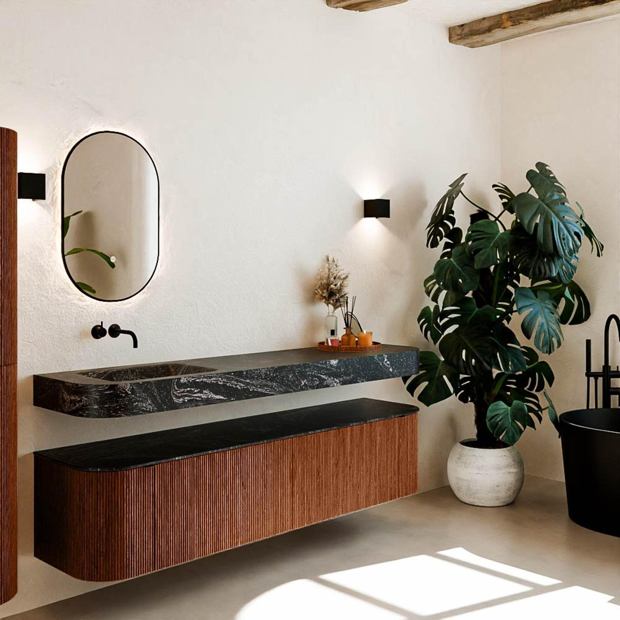 Natuurlijke materialen in warme tinten. De verticale ribbels brengen ritme en textuur in het ontwerp, terwijl het eikenhout zorgt voor een warme, ambachtelijke uitstraling. Kies uit 5 houttinten OAK, WALNUT, DUSK, SHADOW en RUBY zorgvuldig geselecteerde houtkleuren om zowel moderne als klassieke badkamers te verrijken.