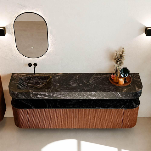 MONDIAZ THOR-DLUX 190cm badmeubel ronding links + rechts kleur Ruby met 2 lades en 2 deuren. Vrijhangende wastafel CLOUD Links zonder kraangat kleur Lava.