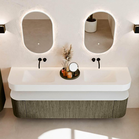 Boven het meubel zweeft een bijpassende, vrij hangende wastafel met afgeronde hoeken – perfect afgestemd op de vorm van de kast. De wastafel is uitgevoerd in Solid Surface en volgt subtiel de lijnen van het onderliggende meubel, waardoor een harmonieus geheel ontstaat. Het Solid Surface topblad vormt een sterke, onderhoudsvriendelijke basis en maakt de combinatie compleet.