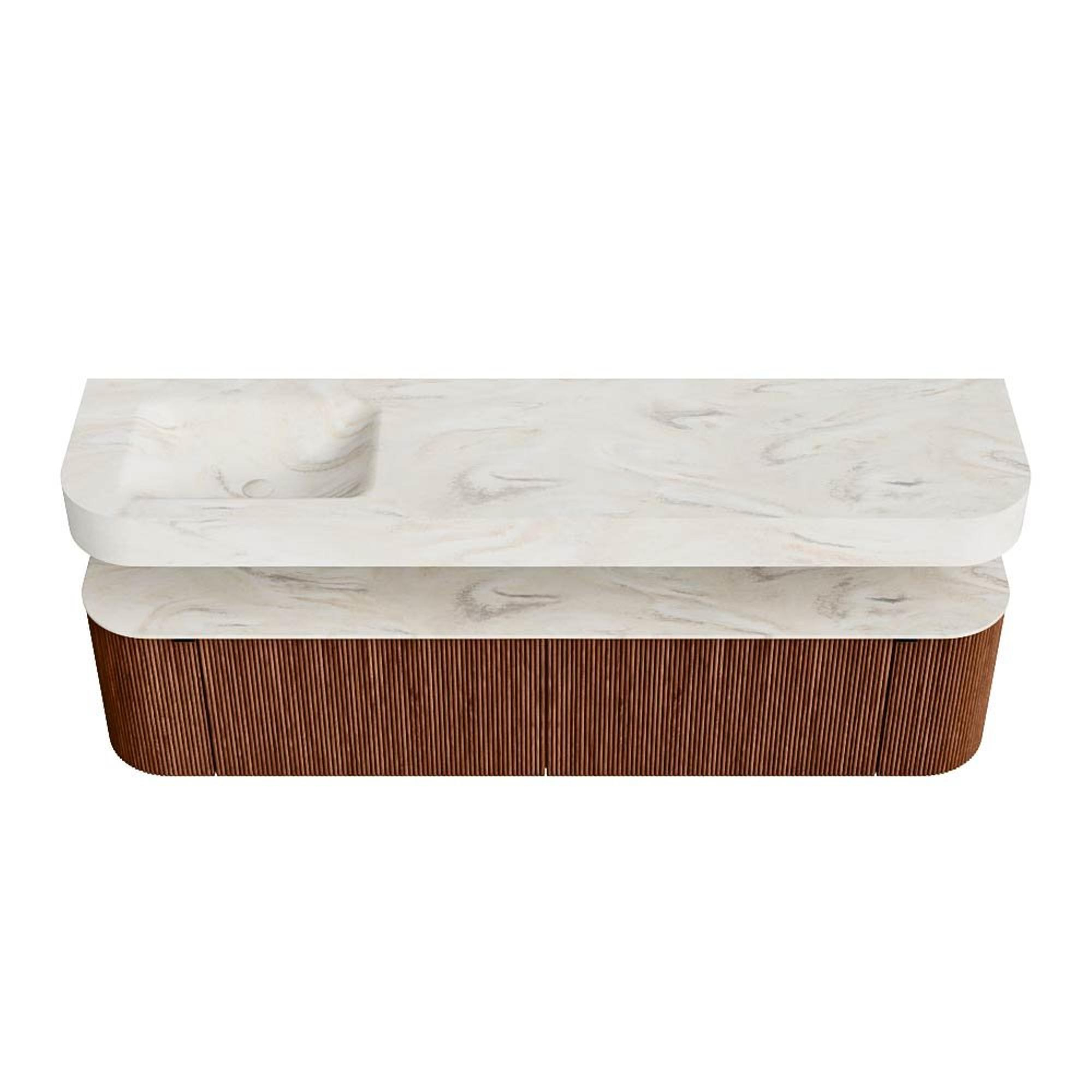 MONDIAZ THOR-DLUX 190cm badmeubel ronding links + rechts kleur Ruby met 2 lades en 2 deuren. Vrijhangende wastafel CLOUD Links zonder kraangat kleur Ostra.