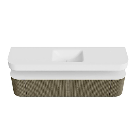 Boven het meubel zweeft een bijpassende, vrij hangende wastafel met afgeronde hoeken – perfect afgestemd op de vorm van de kast. De wastafel is uitgevoerd in Solid Surface en volgt subtiel de lijnen van het onderliggende meubel, waardoor een harmonieus geheel ontstaat. Het Solid Surface topblad vormt een sterke, onderhoudsvriendelijke basis en maakt de combinatie compleet.