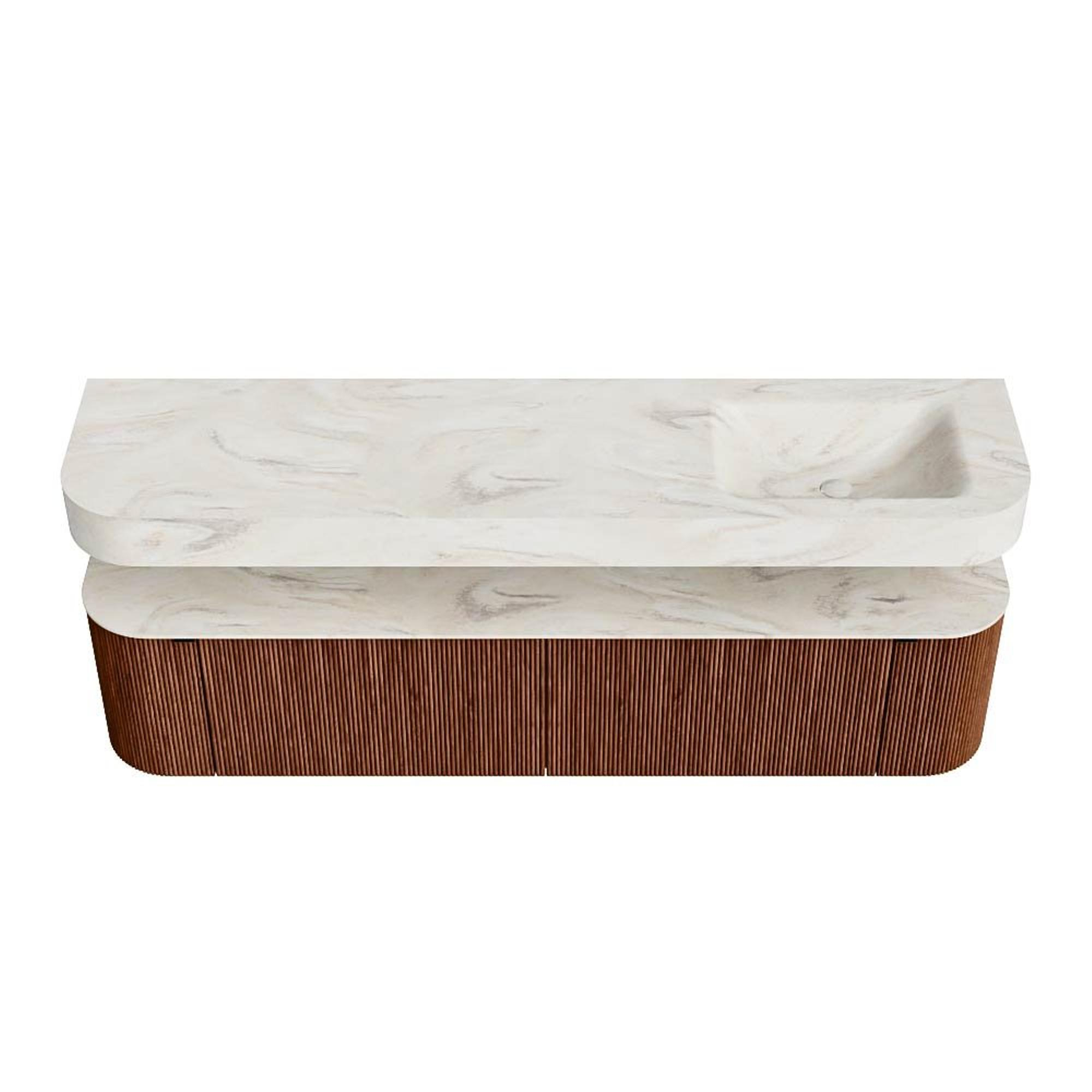 MONDIAZ THOR-DLUX 190cm badmeubel ronding links + rechts kleur Ruby met 2 lades en 2 deuren. Vrijhangende wastafel CLOUD Rechts zonder kraangat kleur Ostra.