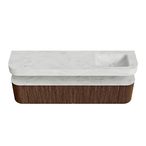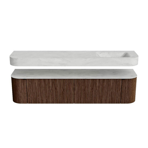 MONDIAZ THOR-DLUX 190cm badmeubel ronding links + rechts kleur Walnut met 2 lades en 2 deuren. Vrijhangende wastafel CLOUD Rechts 1 kraangat kleur Opalo.