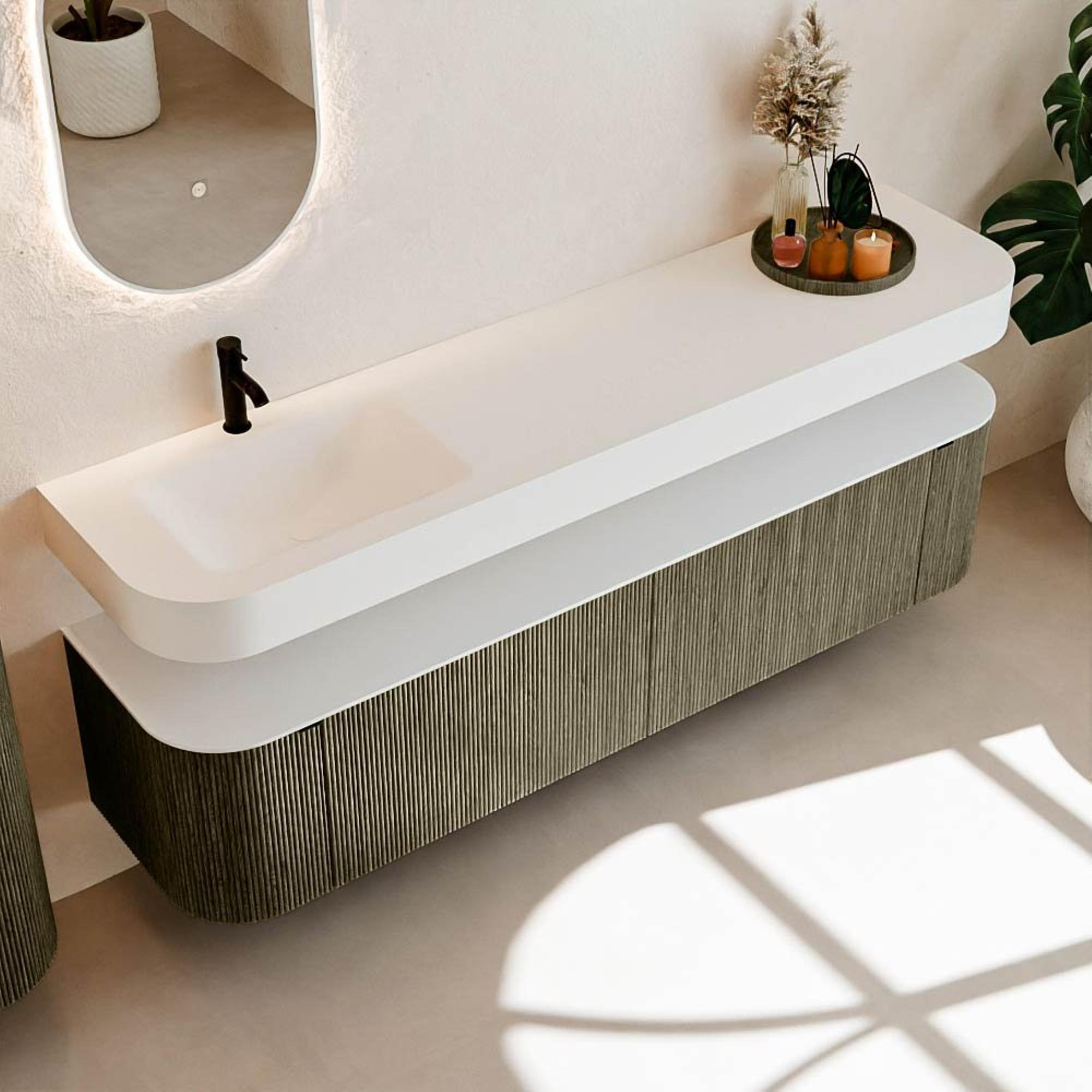 Boven het meubel zweeft een bijpassende, vrij hangende wastafel met afgeronde hoeken – perfect afgestemd op de vorm van de kast. De wastafel is uitgevoerd in Solid Surface en volgt subtiel de lijnen van het onderliggende meubel, waardoor een harmonieus geheel ontstaat. Het Solid Surface topblad vormt een sterke, onderhoudsvriendelijke basis en maakt de combinatie compleet.