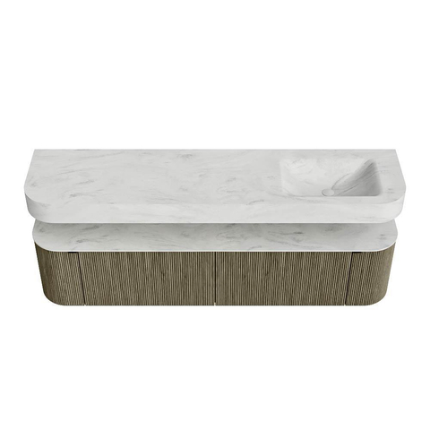 Boven het meubel zweeft een bijpassende, vrij hangende wastafel met afgeronde hoeken – perfect afgestemd op de vorm van de kast. De wastafel is uitgevoerd in Solid Surface en volgt subtiel de lijnen van het onderliggende meubel, waardoor een harmonieus geheel ontstaat. Het Solid Surface topblad vormt een sterke, onderhoudsvriendelijke basis en maakt de combinatie compleet.