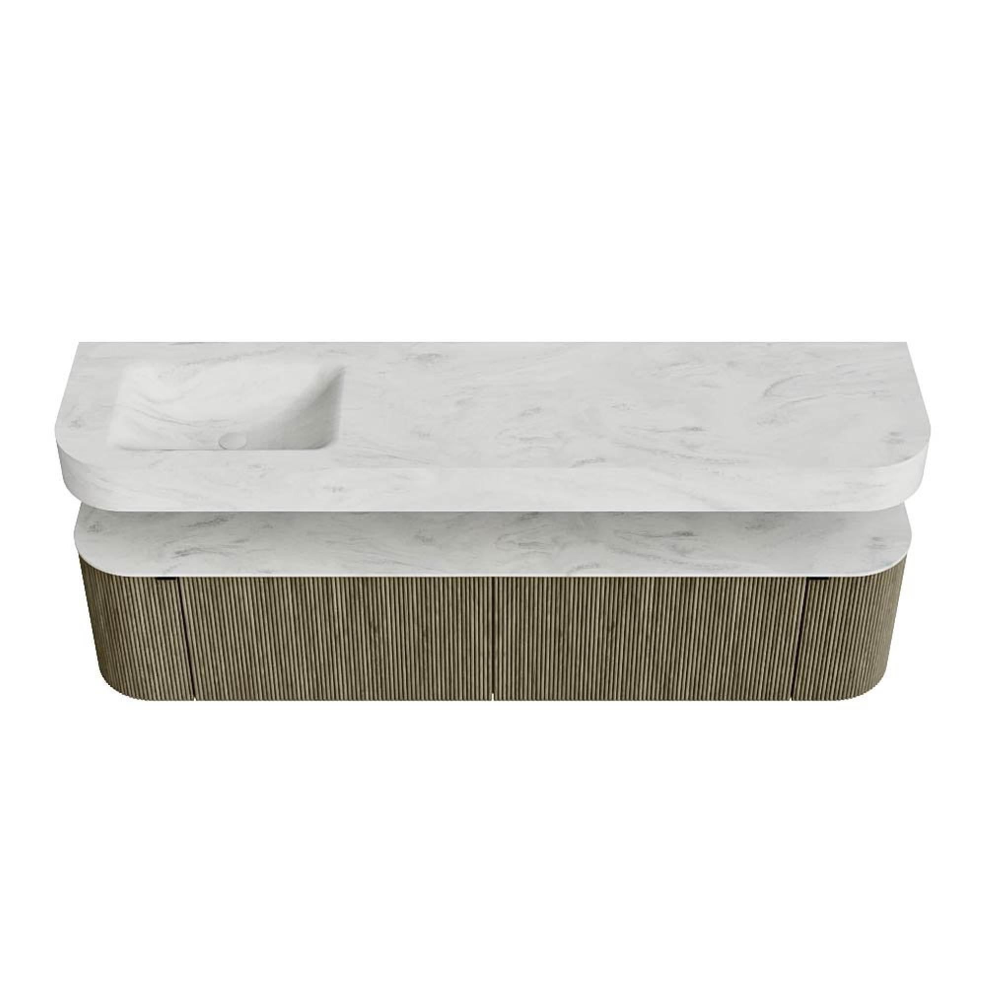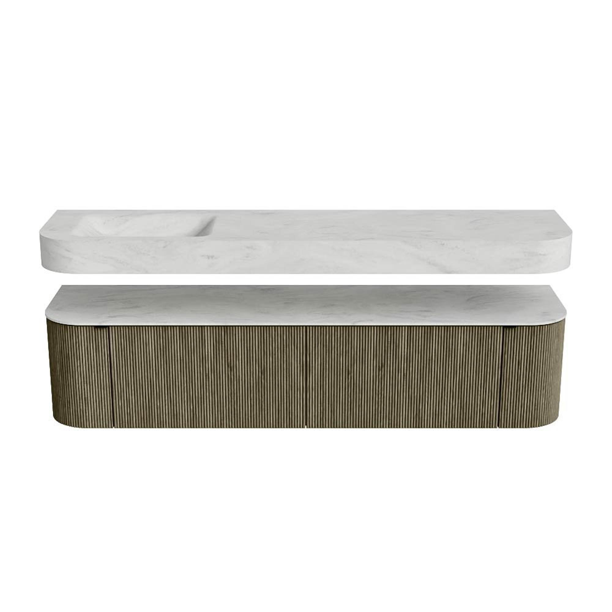Boven het meubel zweeft een bijpassende, vrij hangende wastafel met afgeronde hoeken – perfect afgestemd op de vorm van de kast. De wastafel is uitgevoerd in Solid Surface en volgt subtiel de lijnen van het onderliggende meubel, waardoor een harmonieus geheel ontstaat. Het Solid Surface topblad vormt een sterke, onderhoudsvriendelijke basis en maakt de combinatie compleet.