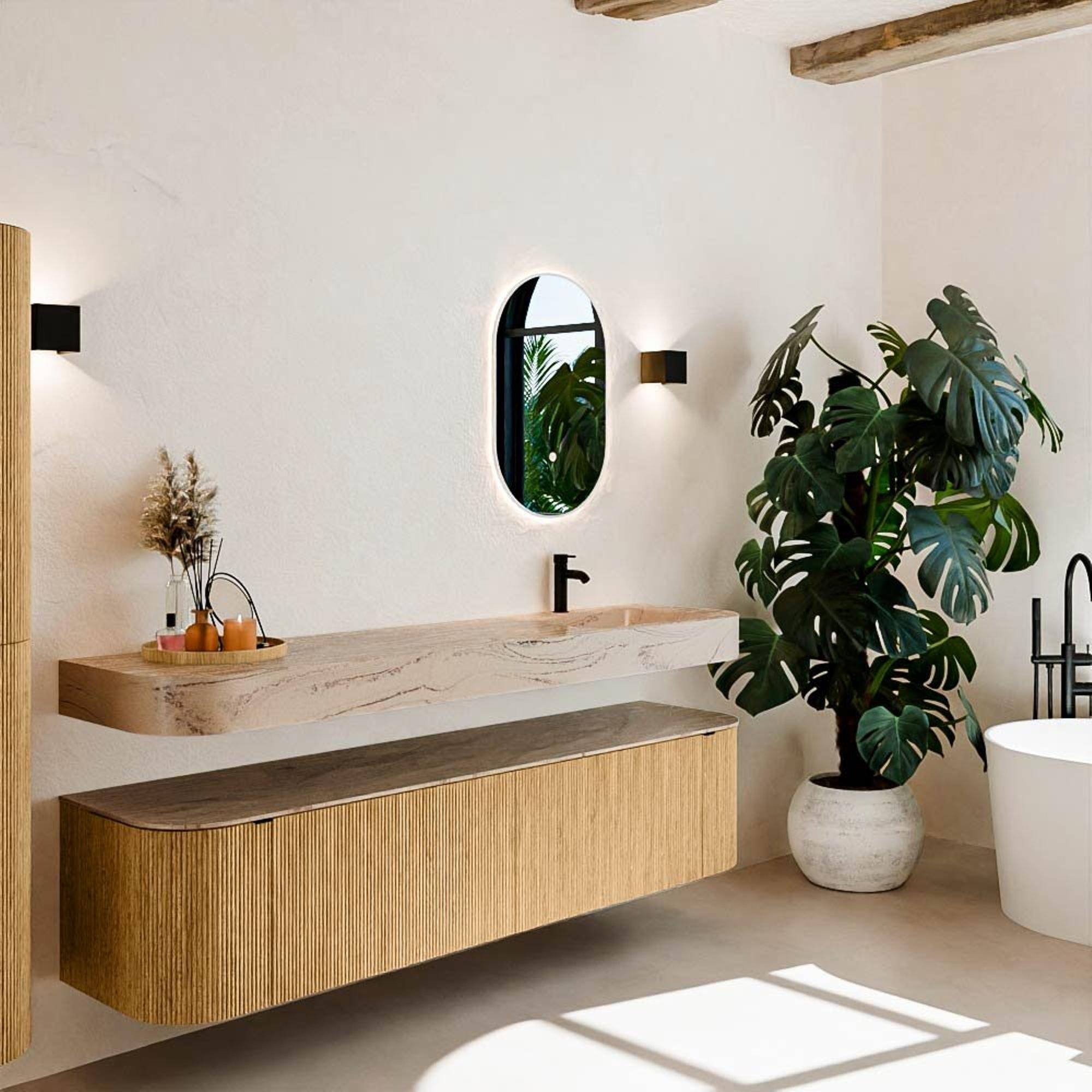 Natuurlijke materialen in warme tinten. De verticale ribbels brengen ritme en textuur in het ontwerp, terwijl het eikenhout zorgt voor een warme, ambachtelijke uitstraling. Kies uit 5 houttinten OAK, WALNUT, DUSK, SHADOW en RUBY zorgvuldig geselecteerde houtkleuren om zowel moderne als klassieke badkamers te verrijken.