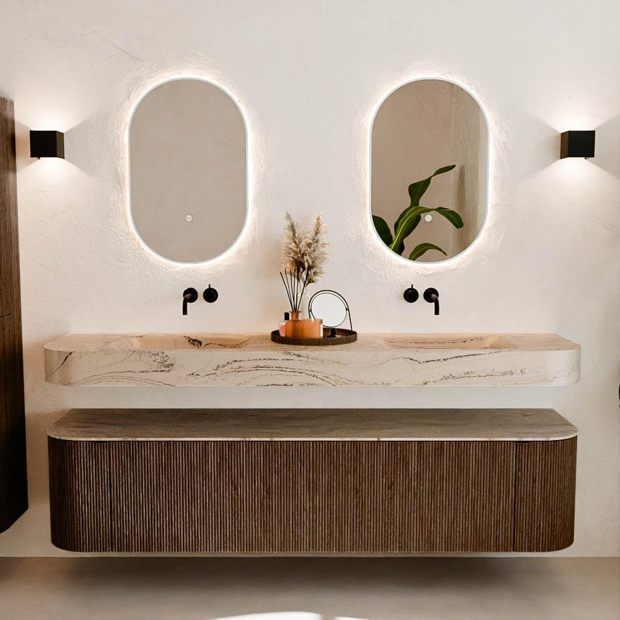 Natuurlijke materialen in warme tinten. De verticale ribbels brengen ritme en textuur in het ontwerp, terwijl het eikenhout zorgt voor een warme, ambachtelijke uitstraling. Kies uit 5 houttinten OAK, WALNUT, DUSK, SHADOW en RUBY zorgvuldig geselecteerde houtkleuren om zowel moderne als klassieke badkamers te verrijken.