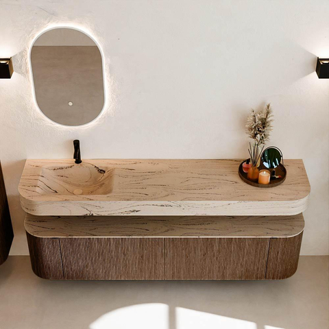MONDIAZ THOR-DLUX 190cm badmeubel ronding links + rechts kleur Walnut met 2 lades en 2 deuren. Vrijhangende wastafel CLOUD Links 1 kraangat kleur Arena.