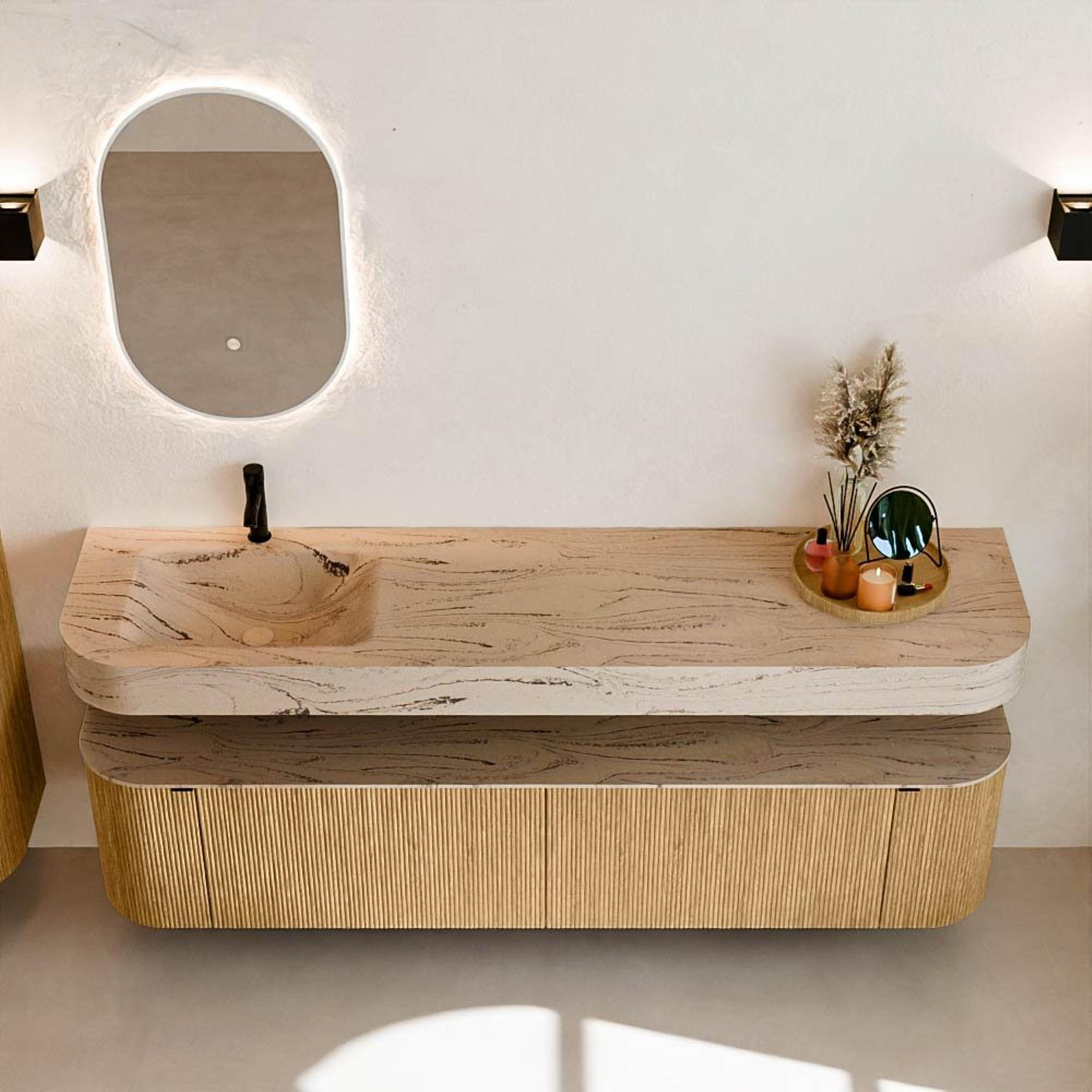 MONDIAZ THOR-DLUX 190cm badmeubel ronding links + rechts kleur Oak met 2 lades en 2 deuren. Vrijhangende wastafel CLOUD Links 1 kraangat kleur Arena.