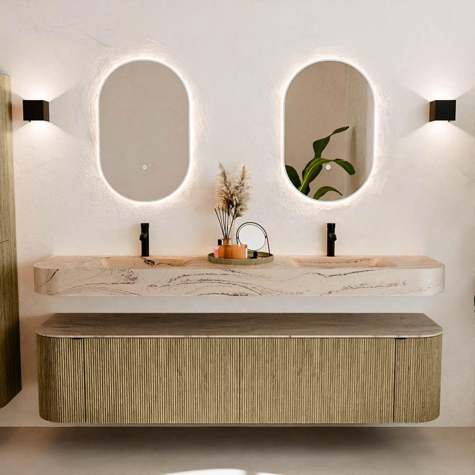 Natuurlijke materialen in warme tinten. De verticale ribbels brengen ritme en textuur in het ontwerp, terwijl het eikenhout zorgt voor een warme, ambachtelijke uitstraling. Kies uit 5 houttinten OAK, WALNUT, DUSK, SHADOW en RUBY zorgvuldig geselecteerde houtkleuren om zowel moderne als klassieke badkamers te verrijken.