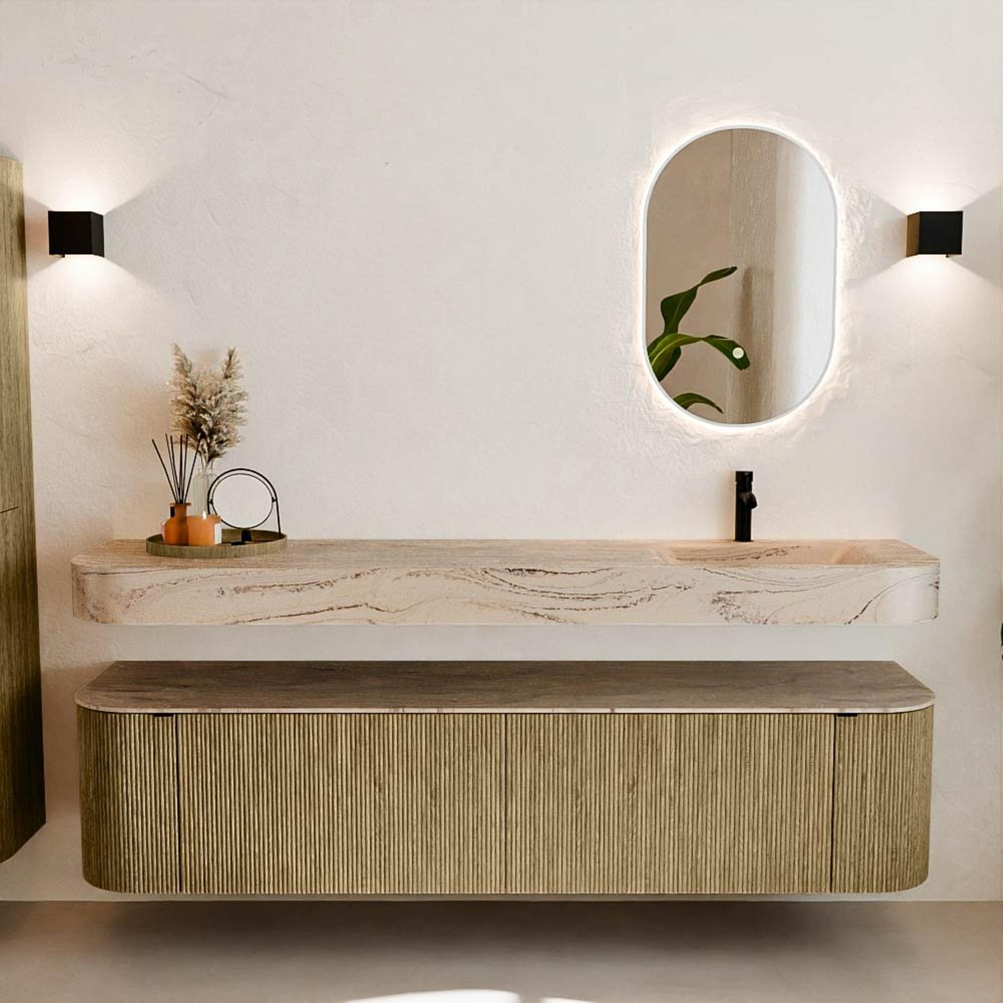 Natuurlijke materialen in warme tinten. De verticale ribbels brengen ritme en textuur in het ontwerp, terwijl het eikenhout zorgt voor een warme, ambachtelijke uitstraling. Kies uit 5 houttinten OAK, WALNUT, DUSK, SHADOW en RUBY zorgvuldig geselecteerde houtkleuren om zowel moderne als klassieke badkamers te verrijken.