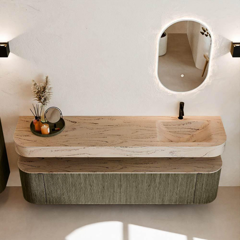 Boven het meubel zweeft een bijpassende, vrij hangende wastafel met afgeronde hoeken – perfect afgestemd op de vorm van de kast. De wastafel is uitgevoerd in Solid Surface en volgt subtiel de lijnen van het onderliggende meubel, waardoor een harmonieus geheel ontstaat. Het Solid Surface topblad vormt een sterke, onderhoudsvriendelijke basis en maakt de combinatie compleet.