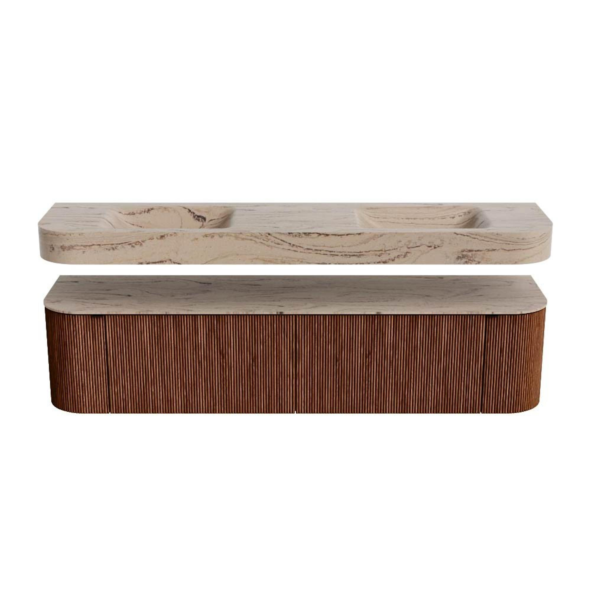 MONDIAZ THOR-DLUX 190cm badmeubel ronding links + rechts kleur Ruby met 2 lades en 2 deuren. Vrijhangende wastafel CLOUD Dubbel zonder kraangat kleur Arena.