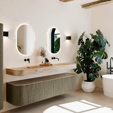 Natuurlijke materialen in warme tinten. De verticale ribbels brengen ritme en textuur in het ontwerp, terwijl het eikenhout zorgt voor een warme, ambachtelijke uitstraling. Kies uit 5 houttinten OAK, WALNUT, DUSK, SHADOW en RUBY zorgvuldig geselecteerde houtkleuren om zowel moderne als klassieke badkamers te verrijken.