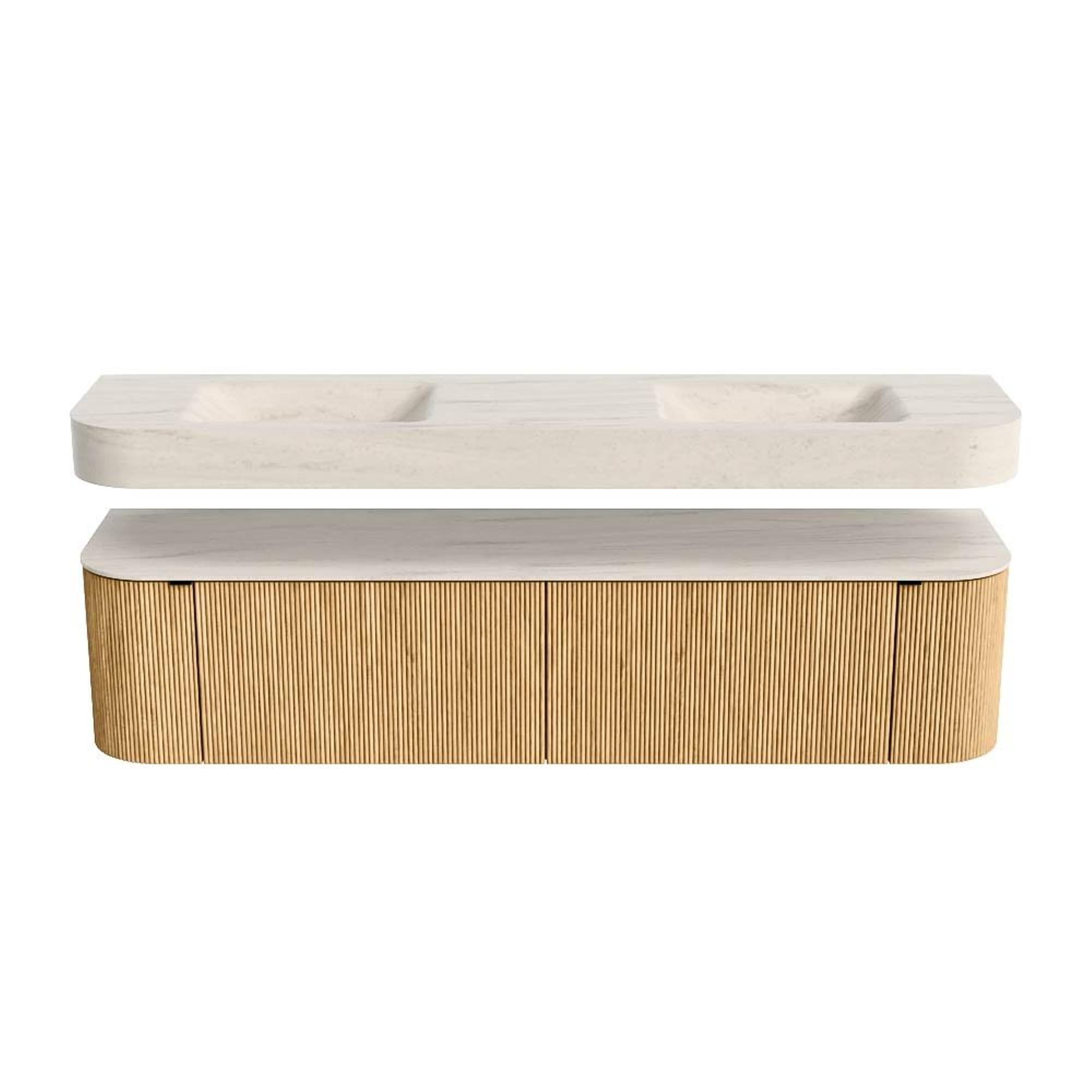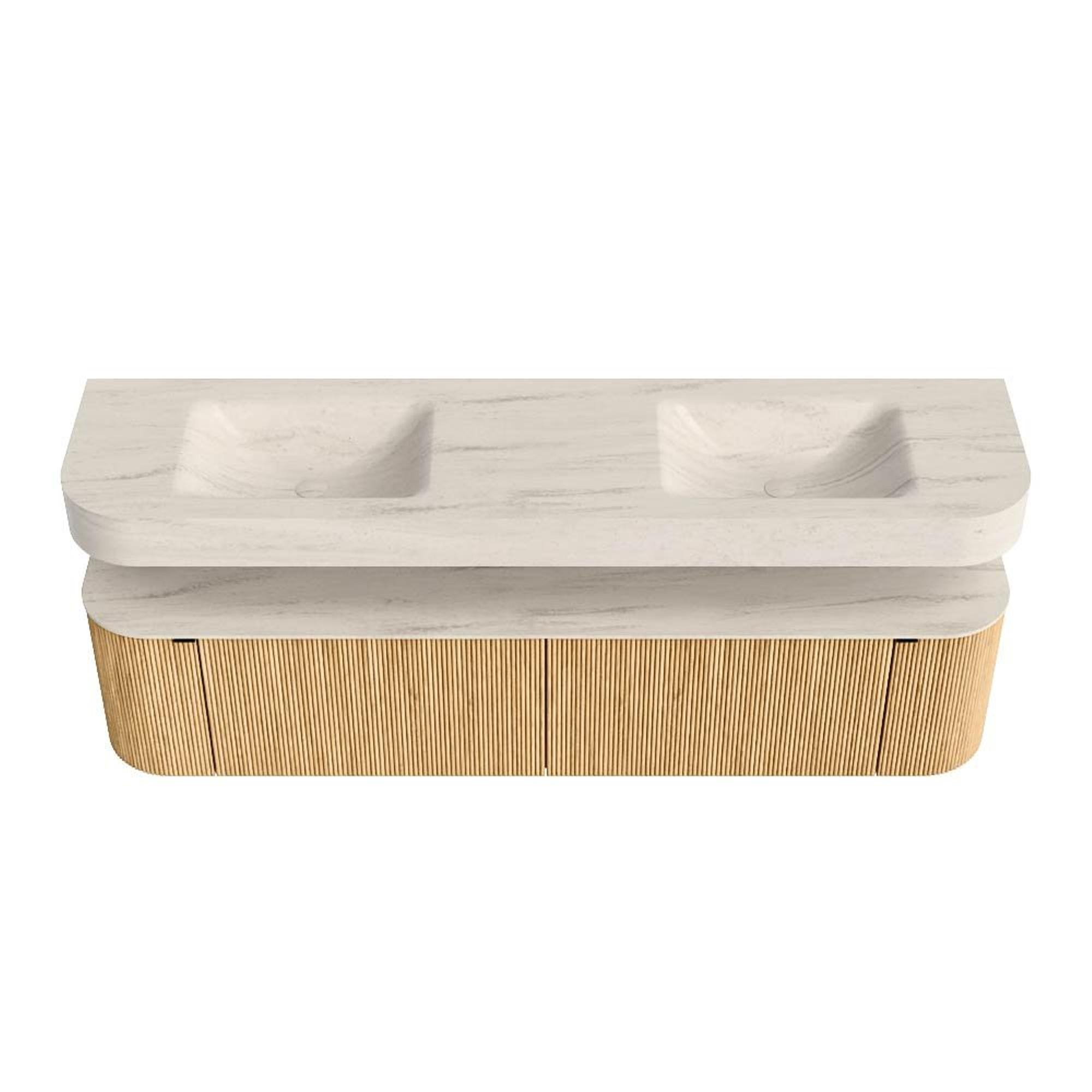 MONDIAZ THOR-DLUX 190cm badmeubel ronding links + rechts kleur Oak met 2 lades en 2 deuren. Vrijhangende wastafel CLOUD Dubbel zonder kraangat kleur Meli.