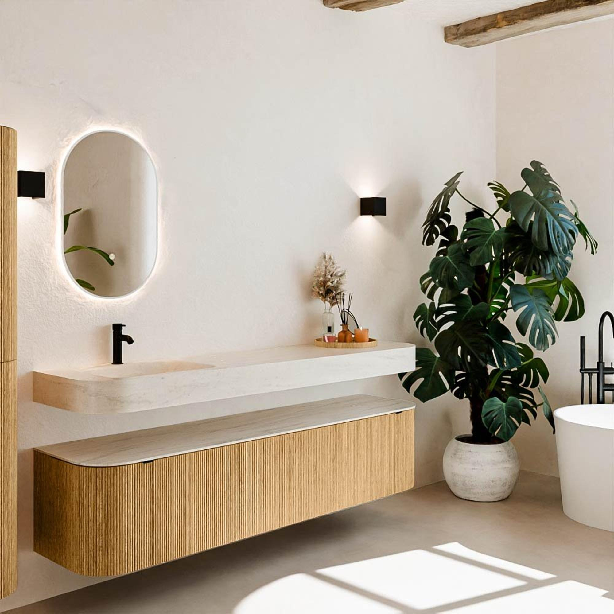 Natuurlijke materialen in warme tinten. De verticale ribbels brengen ritme en textuur in het ontwerp, terwijl het eikenhout zorgt voor een warme, ambachtelijke uitstraling. Kies uit 5 houttinten OAK, WALNUT, DUSK, SHADOW en RUBY zorgvuldig geselecteerde houtkleuren om zowel moderne als klassieke badkamers te verrijken.