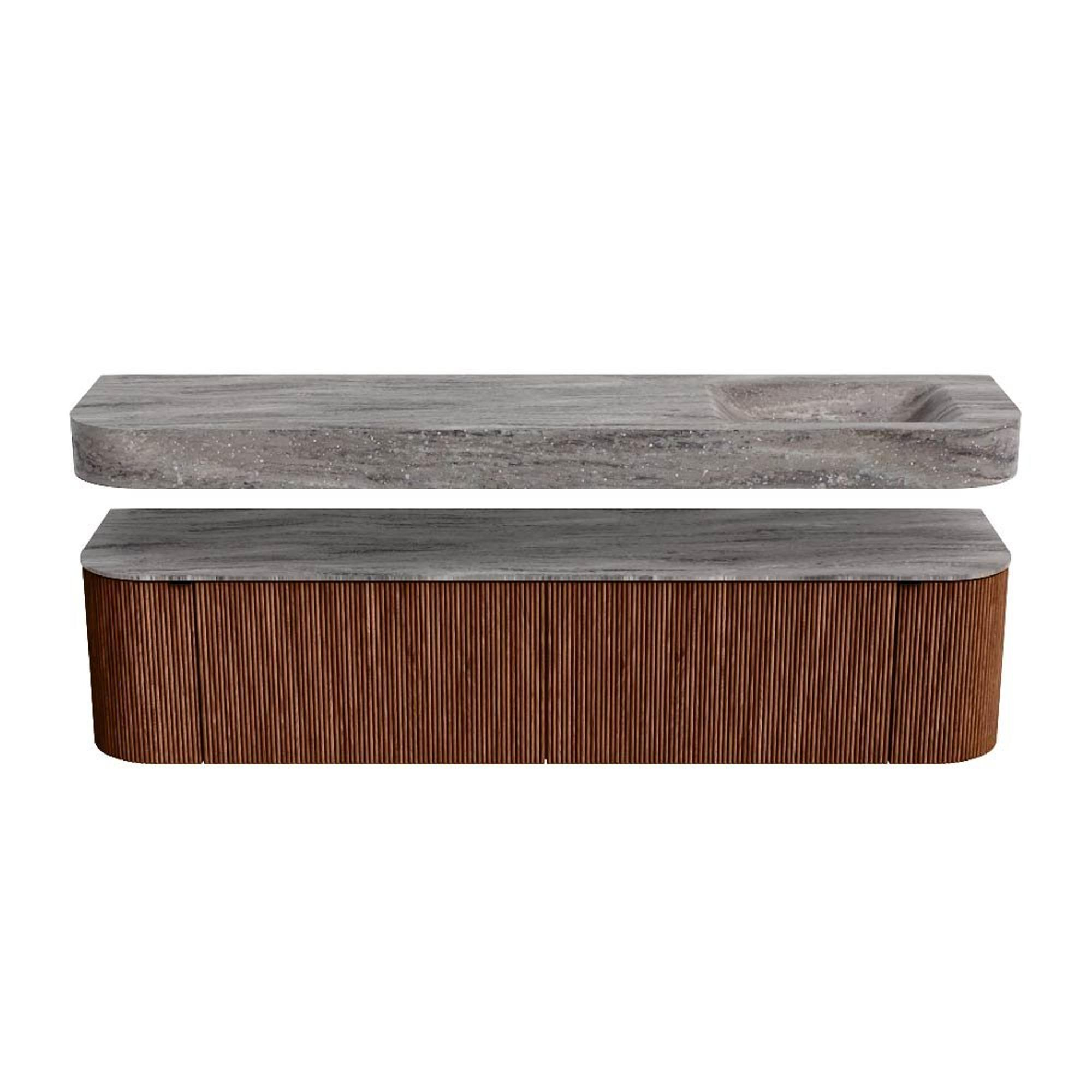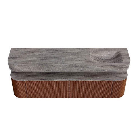 Boven het meubel zweeft een bijpassende, vrij hangende wastafel met afgeronde hoeken – perfect afgestemd op de vorm van de kast. De wastafel is uitgevoerd in Solid Surface en volgt subtiel de lijnen van het onderliggende meubel, waardoor een harmonieus geheel ontstaat. Het Solid Surface topblad vormt een sterke, onderhoudsvriendelijke basis en maakt de combinatie compleet.