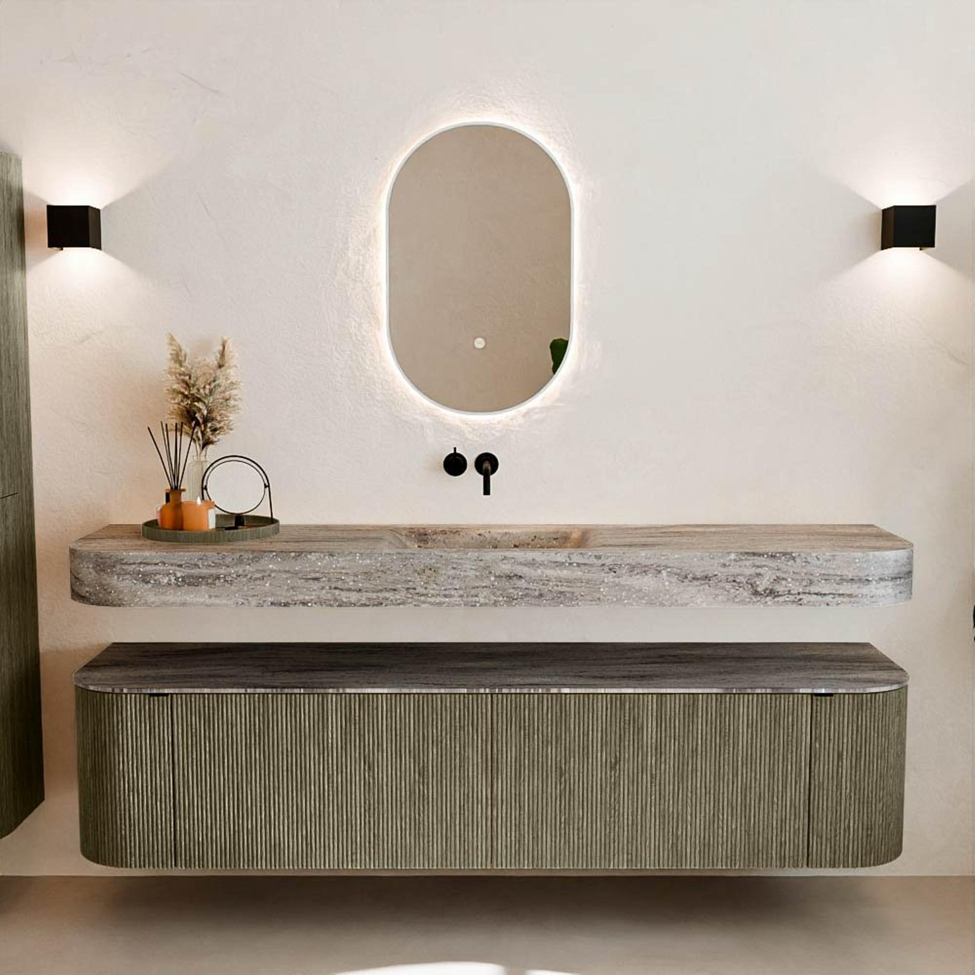 Natuurlijke materialen in warme tinten. De verticale ribbels brengen ritme en textuur in het ontwerp, terwijl het eikenhout zorgt voor een warme, ambachtelijke uitstraling. Kies uit 5 houttinten OAK, WALNUT, DUSK, SHADOW en RUBY zorgvuldig geselecteerde houtkleuren om zowel moderne als klassieke badkamers te verrijken.