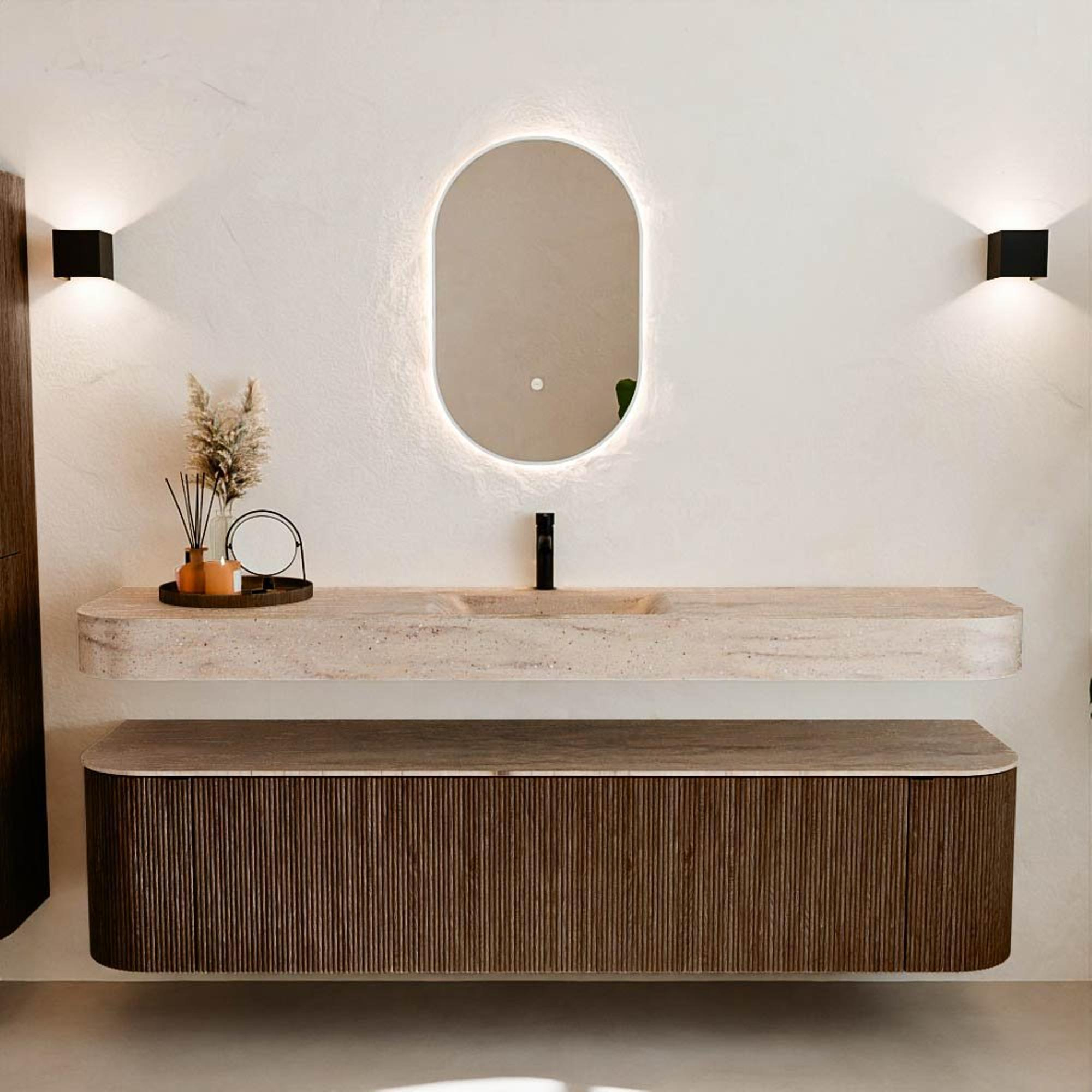 Natuurlijke materialen in warme tinten. De verticale ribbels brengen ritme en textuur in het ontwerp, terwijl het eikenhout zorgt voor een warme, ambachtelijke uitstraling. Kies uit 5 houttinten OAK, WALNUT, DUSK, SHADOW en RUBY zorgvuldig geselecteerde houtkleuren om zowel moderne als klassieke badkamers te verrijken.