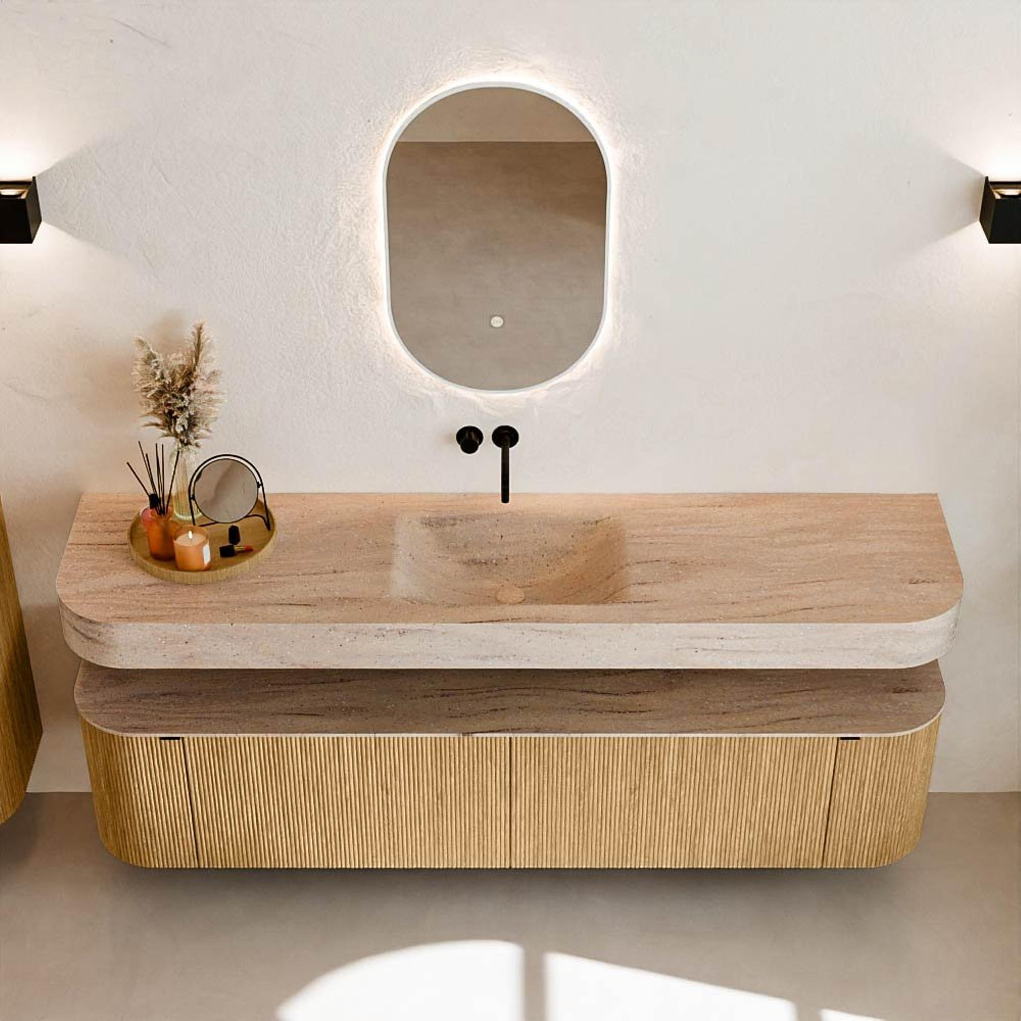 Natuurlijke materialen in warme tinten. De verticale ribbels brengen ritme en textuur in het ontwerp, terwijl het eikenhout zorgt voor een warme, ambachtelijke uitstraling. Kies uit 5 houttinten OAK, WALNUT, DUSK, SHADOW en RUBY zorgvuldig geselecteerde houtkleuren om zowel moderne als klassieke badkamers te verrijken.