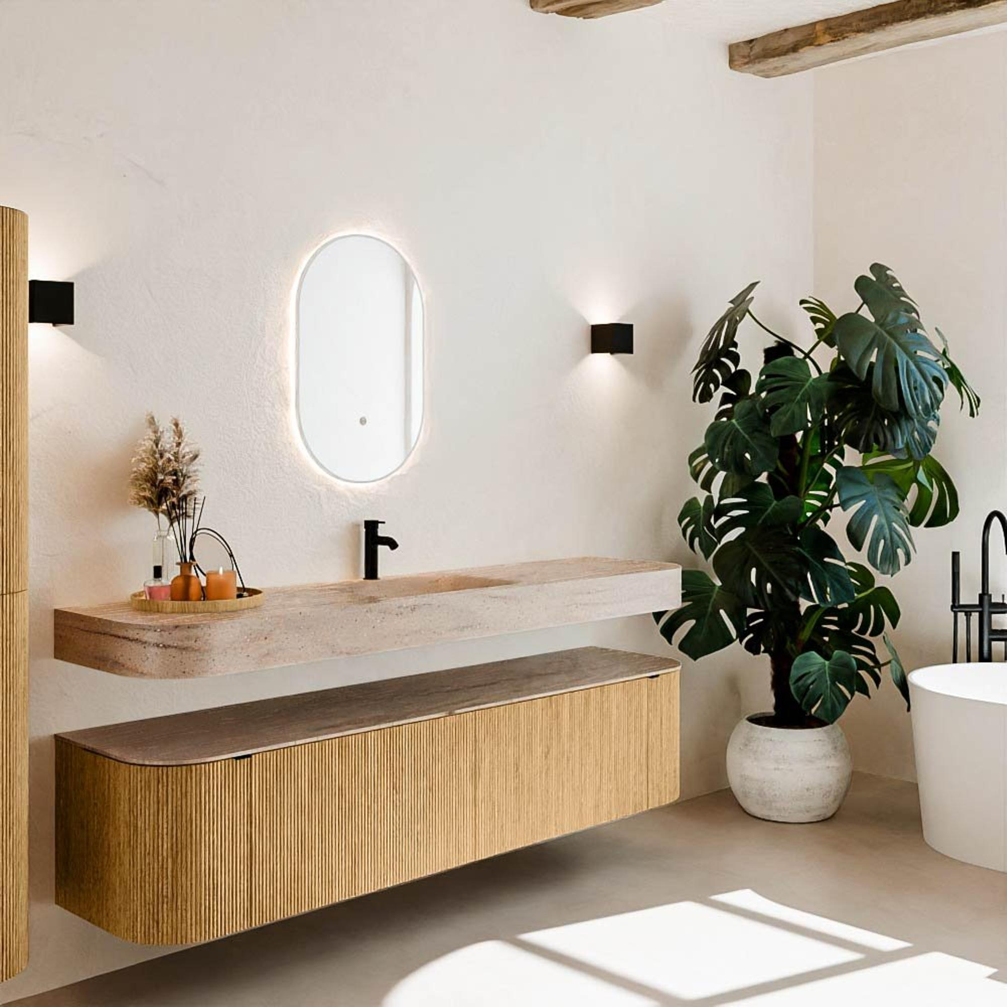 Natuurlijke materialen in warme tinten. De verticale ribbels brengen ritme en textuur in het ontwerp, terwijl het eikenhout zorgt voor een warme, ambachtelijke uitstraling. Kies uit 5 houttinten OAK, WALNUT, DUSK, SHADOW en RUBY zorgvuldig geselecteerde houtkleuren om zowel moderne als klassieke badkamers te verrijken.