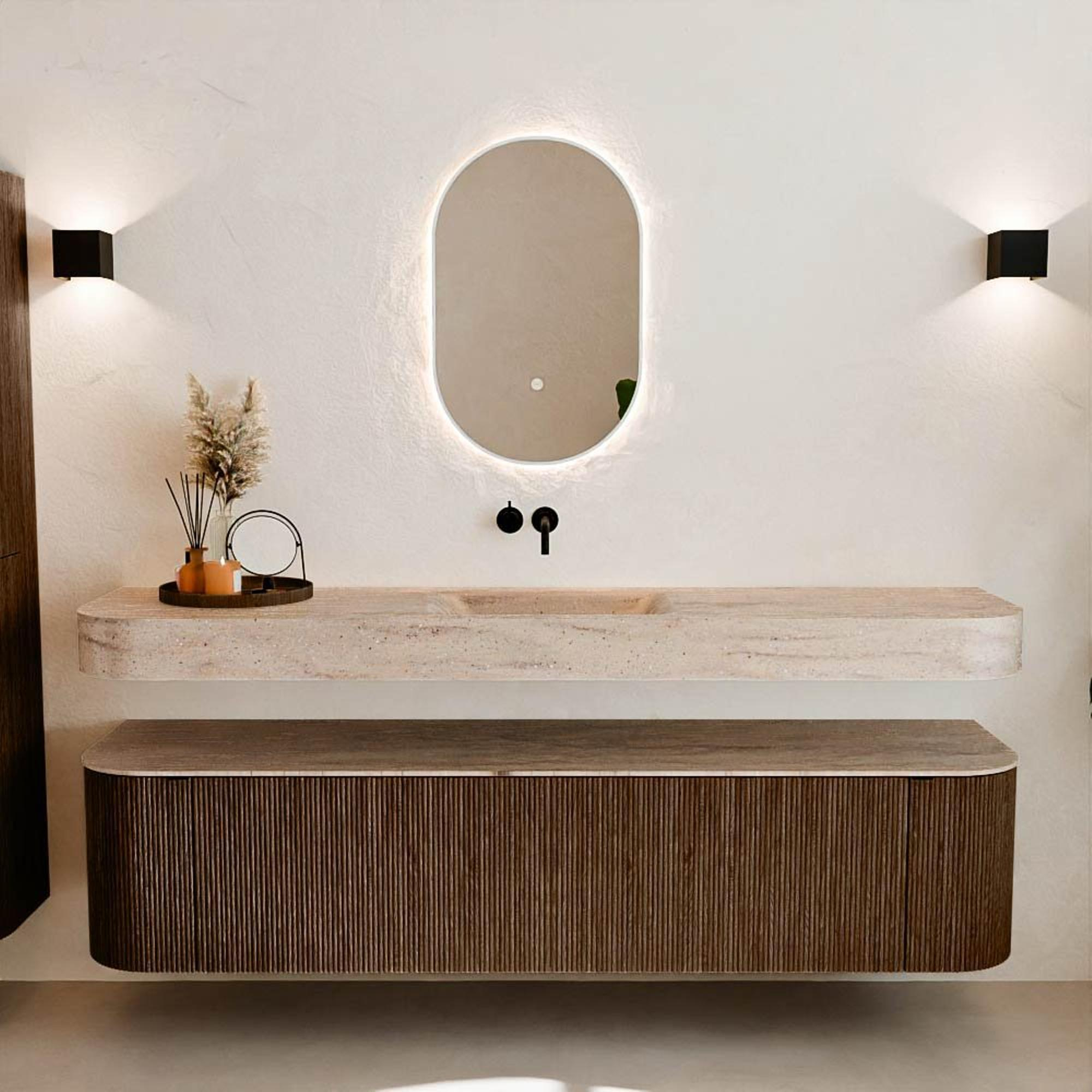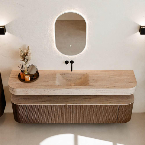 Natuurlijke materialen in warme tinten. De verticale ribbels brengen ritme en textuur in het ontwerp, terwijl het eikenhout zorgt voor een warme, ambachtelijke uitstraling. Kies uit 5 houttinten OAK, WALNUT, DUSK, SHADOW en RUBY zorgvuldig geselecteerde houtkleuren om zowel moderne als klassieke badkamers te verrijken.