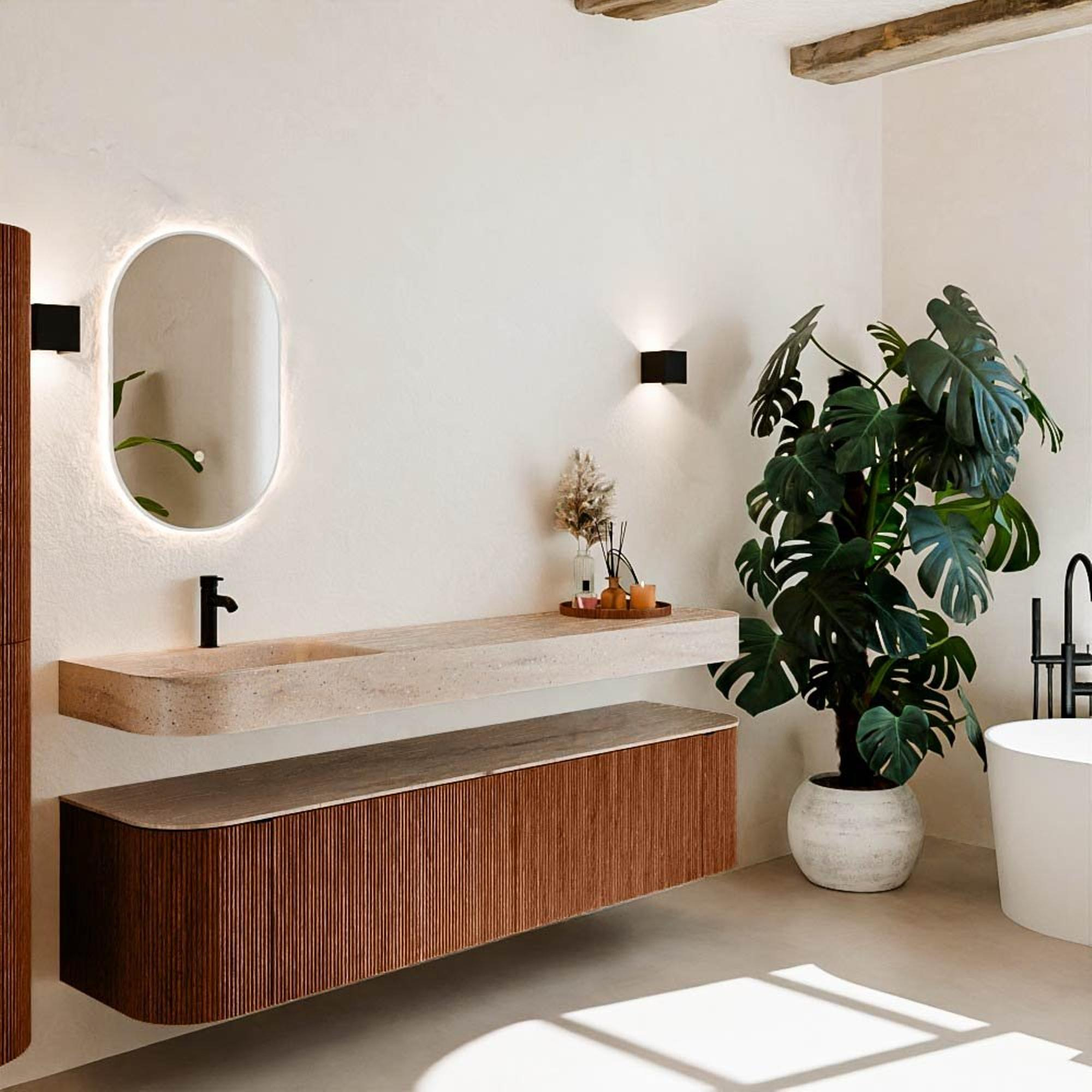 Natuurlijke materialen in warme tinten. De verticale ribbels brengen ritme en textuur in het ontwerp, terwijl het eikenhout zorgt voor een warme, ambachtelijke uitstraling. Kies uit 5 houttinten OAK, WALNUT, DUSK, SHADOW en RUBY zorgvuldig geselecteerde houtkleuren om zowel moderne als klassieke badkamers te verrijken.