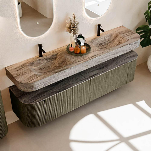 Natuurlijke materialen in warme tinten. De verticale ribbels brengen ritme en textuur in het ontwerp, terwijl het eikenhout zorgt voor een warme, ambachtelijke uitstraling. Kies uit 5 houttinten OAK, WALNUT, DUSK, SHADOW en RUBY zorgvuldig geselecteerde houtkleuren om zowel moderne als klassieke badkamers te verrijken.