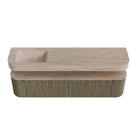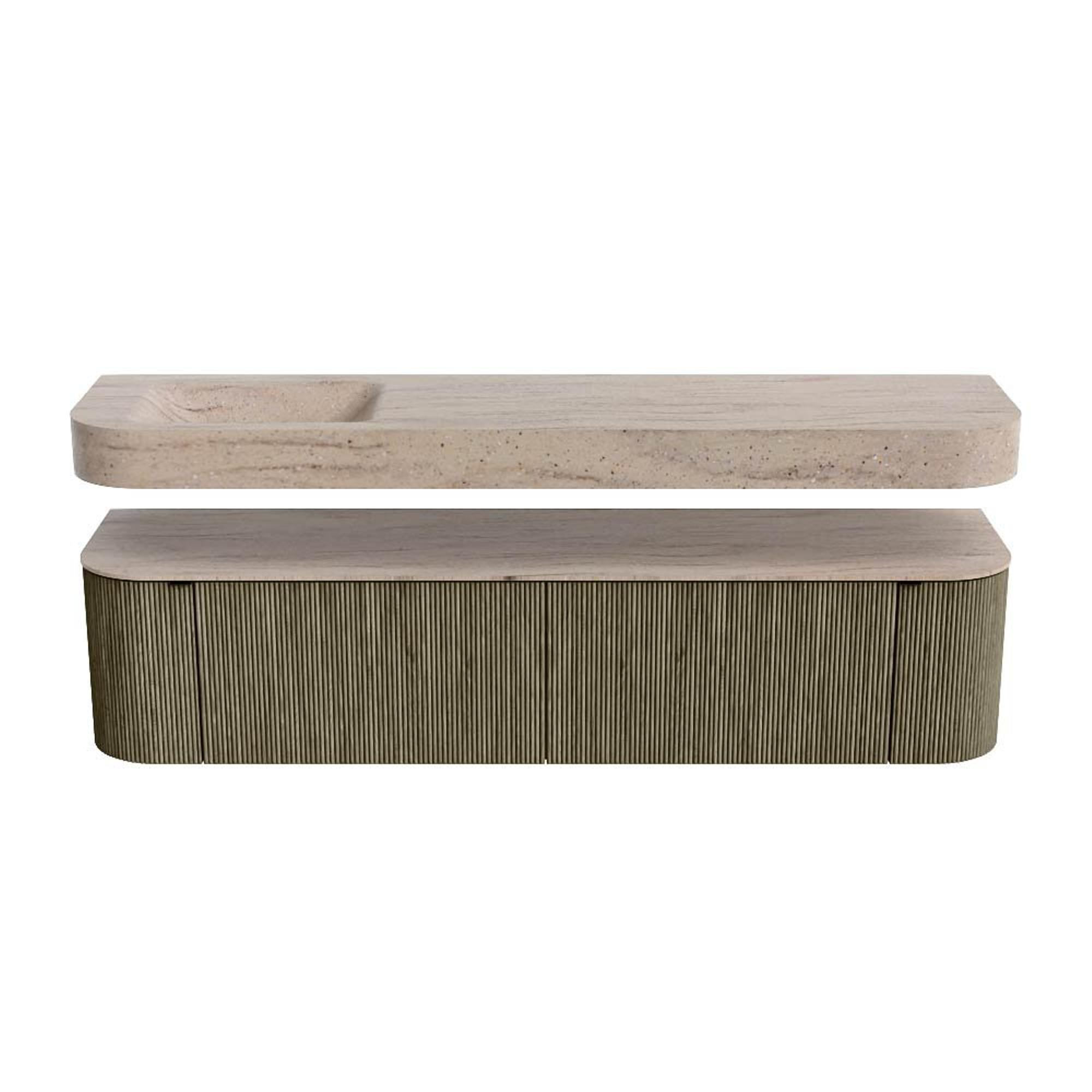 Boven het meubel zweeft een bijpassende, vrij hangende wastafel met afgeronde hoeken – perfect afgestemd op de vorm van de kast. De wastafel is uitgevoerd in Solid Surface en volgt subtiel de lijnen van het onderliggende meubel, waardoor een harmonieus geheel ontstaat. Het Solid Surface topblad vormt een sterke, onderhoudsvriendelijke basis en maakt de combinatie compleet.