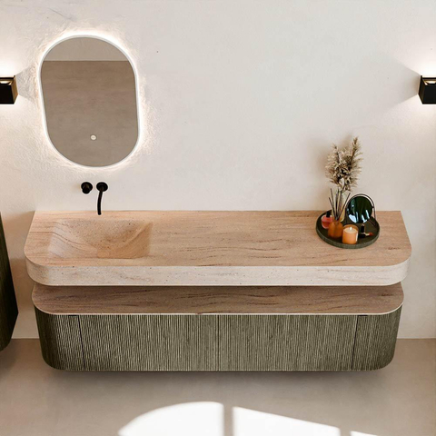 Natuurlijke materialen in warme tinten. De verticale ribbels brengen ritme en textuur in het ontwerp, terwijl het eikenhout zorgt voor een warme, ambachtelijke uitstraling. Kies uit 5 houttinten OAK, WALNUT, DUSK, SHADOW en RUBY zorgvuldig geselecteerde houtkleuren om zowel moderne als klassieke badkamers te verrijken.