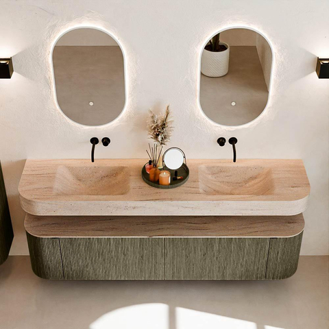 Natuurlijke materialen in warme tinten. De verticale ribbels brengen ritme en textuur in het ontwerp, terwijl het eikenhout zorgt voor een warme, ambachtelijke uitstraling. Kies uit 5 houttinten OAK, WALNUT, DUSK, SHADOW en RUBY zorgvuldig geselecteerde houtkleuren om zowel moderne als klassieke badkamers te verrijken.