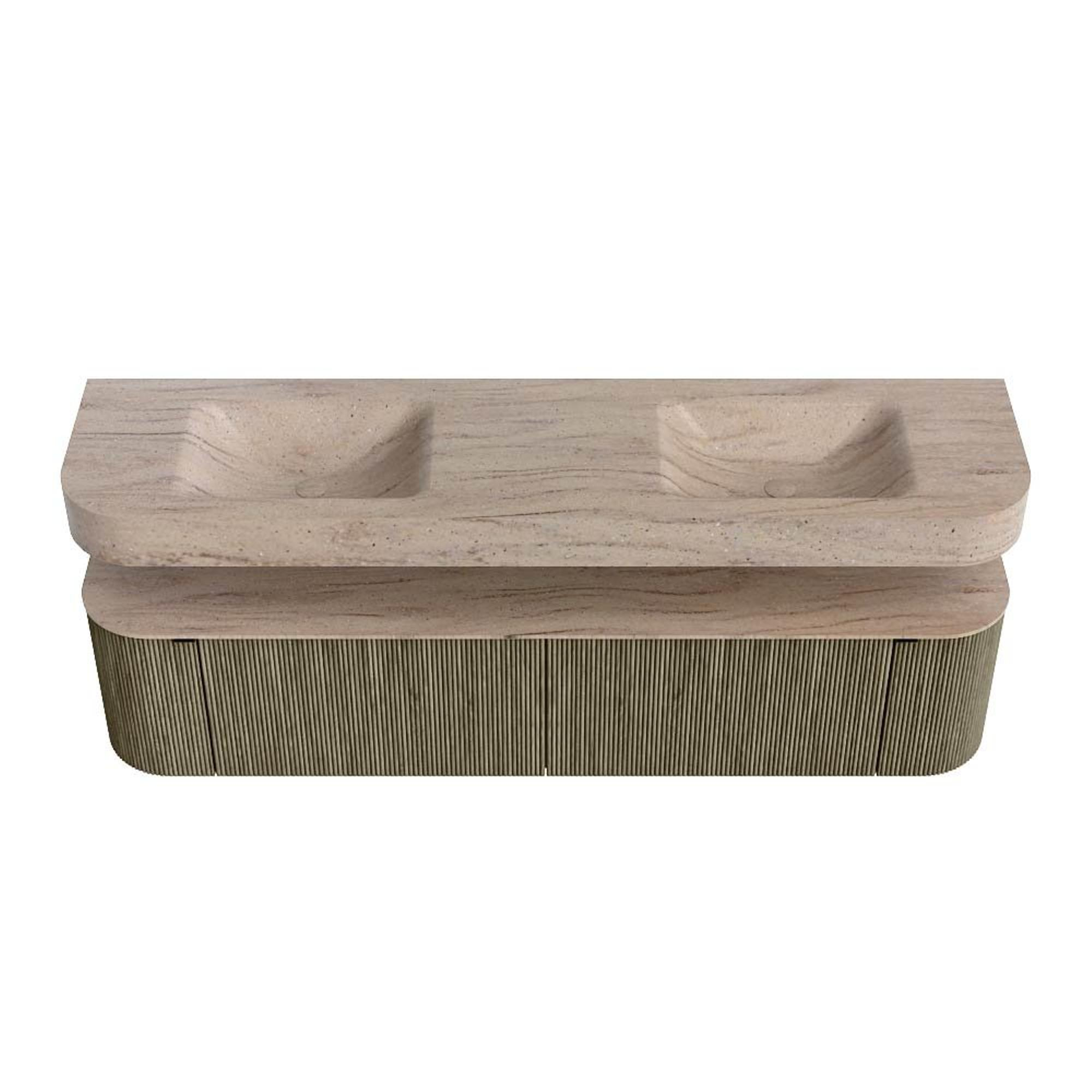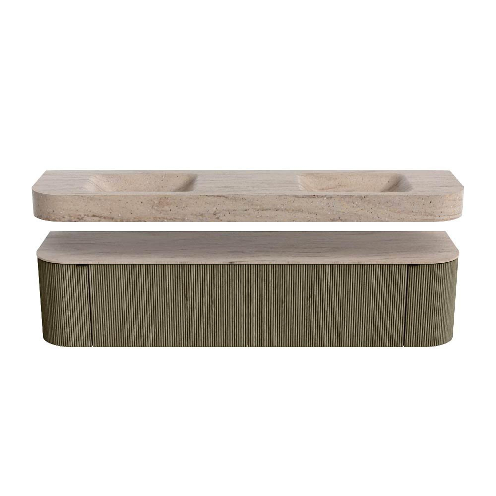 MONDIAZ THOR-DLUX 190cm badmeubel ronding links + rechts kleur Shadow met 2 lades en 2 deuren. Vrijhangende wastafel CLOUD Dubbel 2 kraangaten kleur Saba.